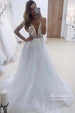 White Tulle A-line Deep V-neck Wedding Dresses With Lace Appliques.