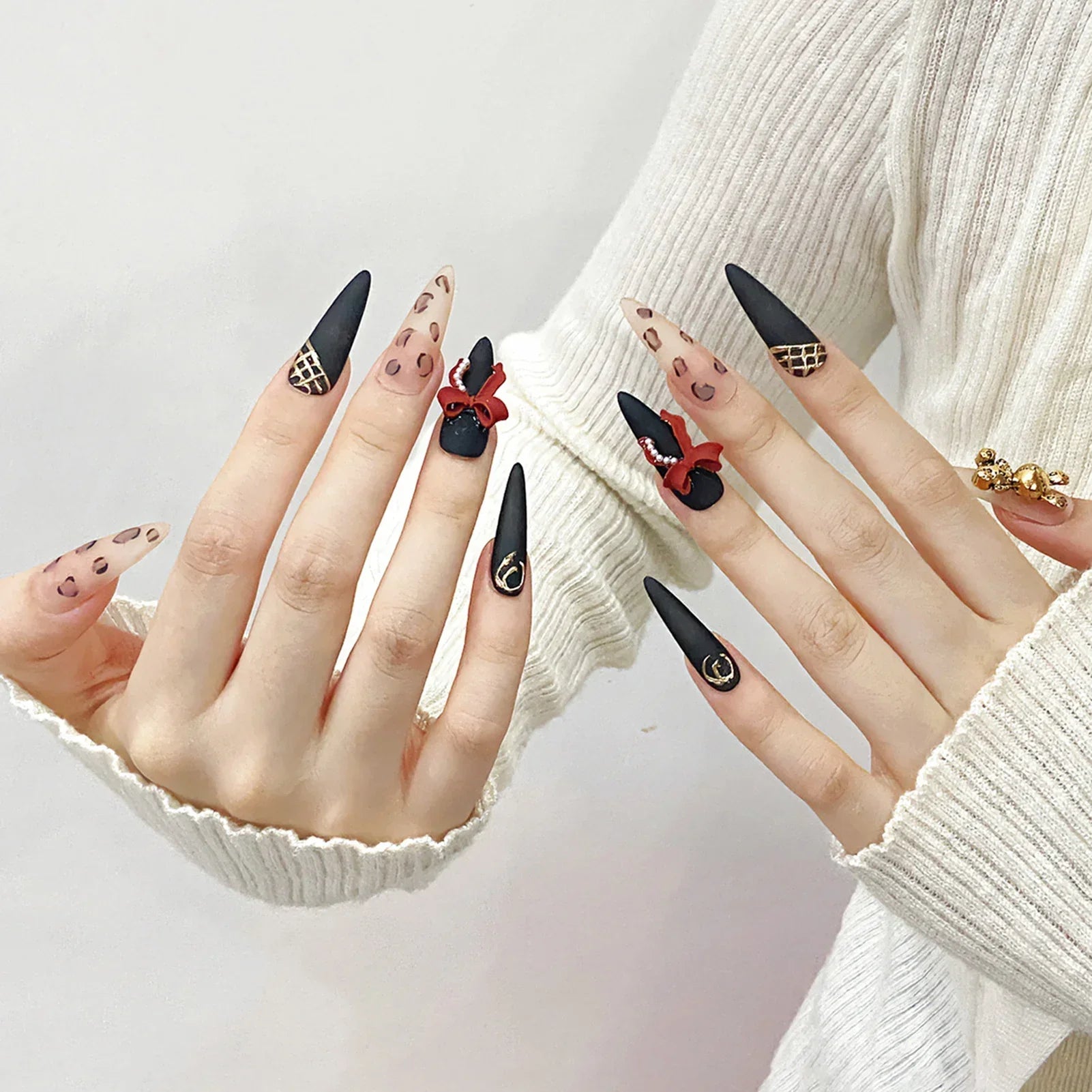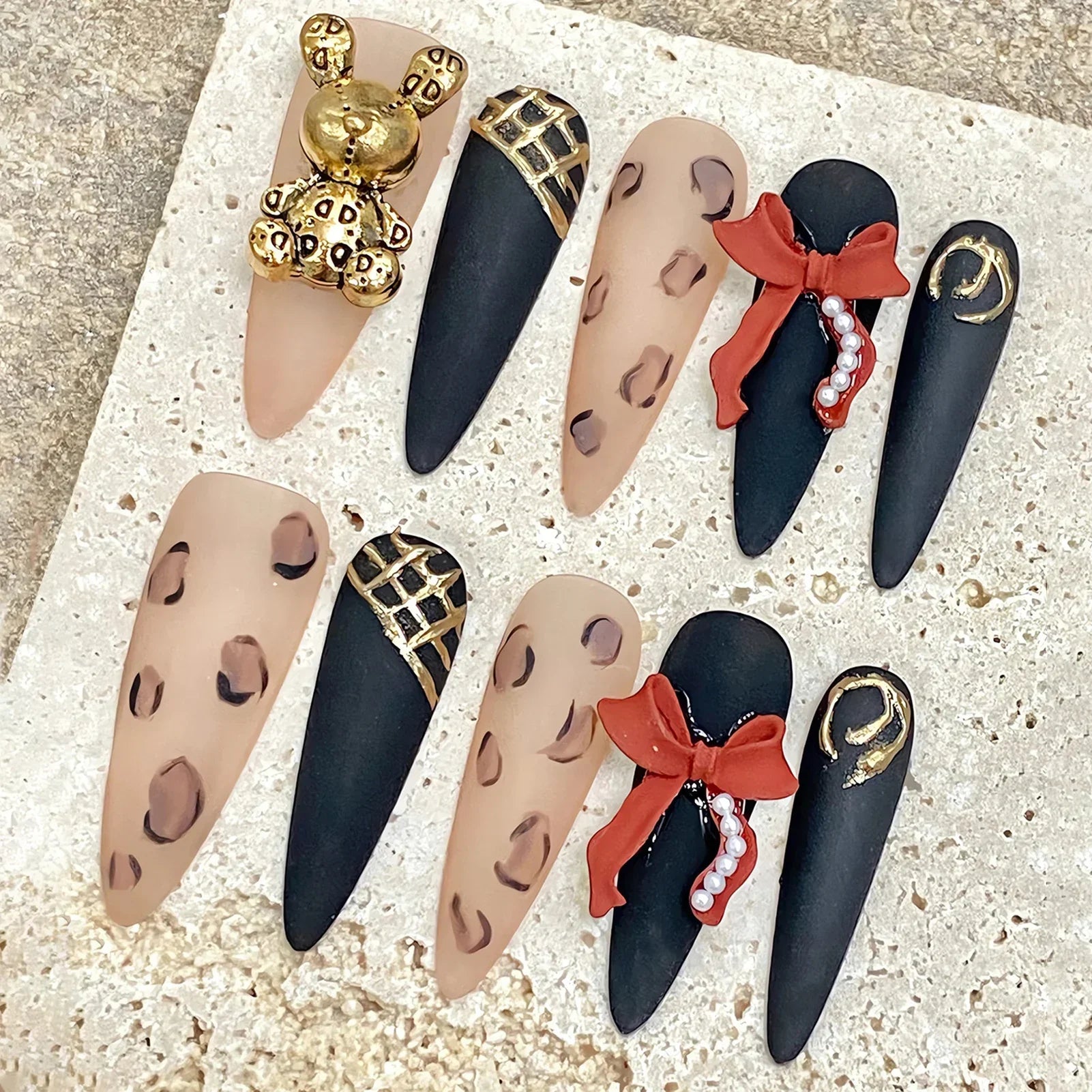 10pcs Leopard Print Press On Nails Gold Bear 3D Red Bowknot Baroque Handmade Fake Nail Heavy Luxury Long Stiletto False Nail Tip