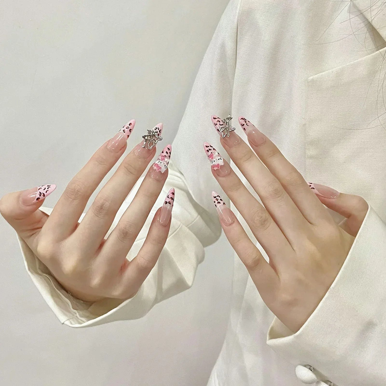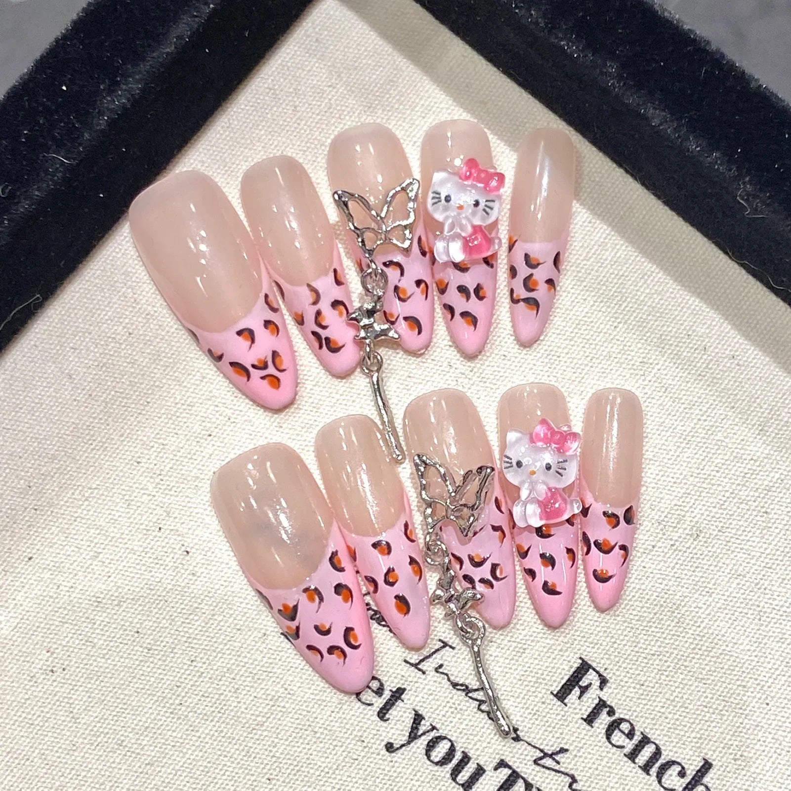 10pcs Pink French Fake Nail Patches Handmade Long Almond Press On Nails Leopard Print Metal Chain Designs False Nail Tips Art