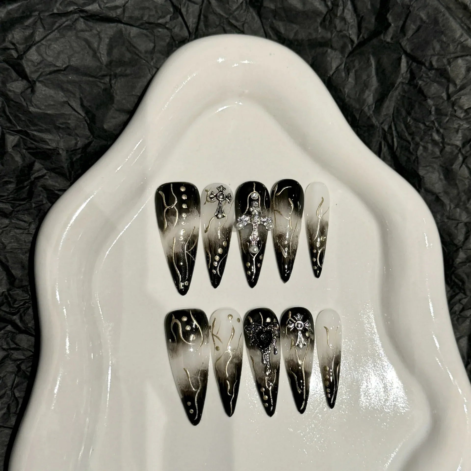 10pcs Y2k Long Stiletto False Nail Tips Gradient Black Metal Heart Cross Decor Handmade Press On Nails Sweet Cool DIY Manicure