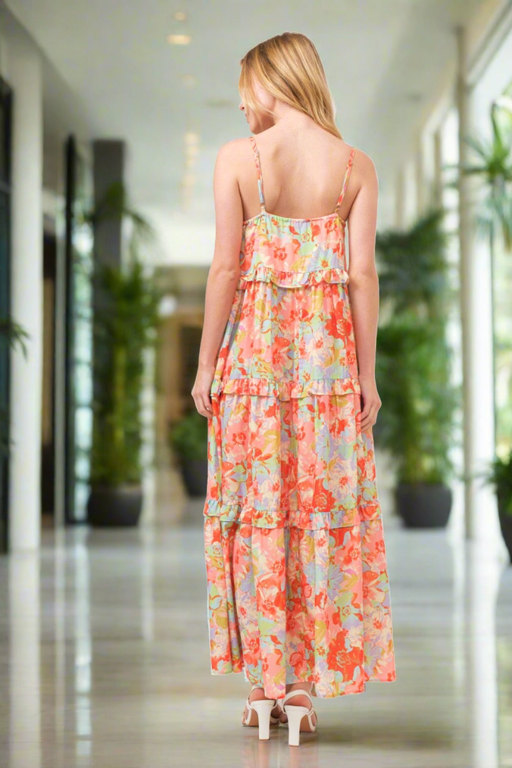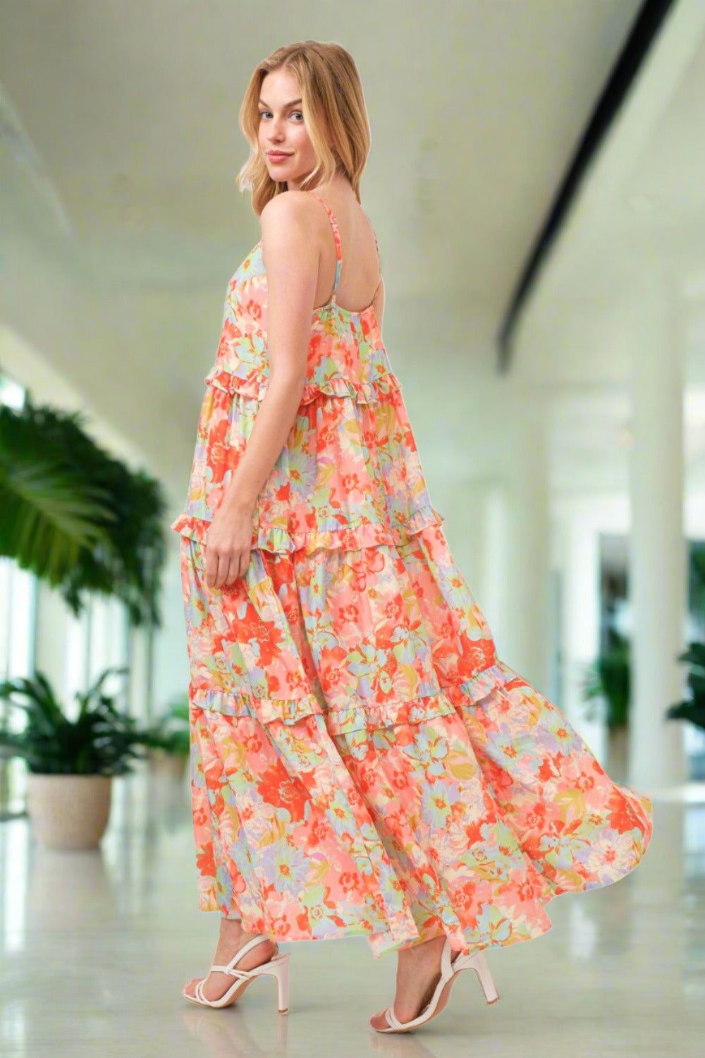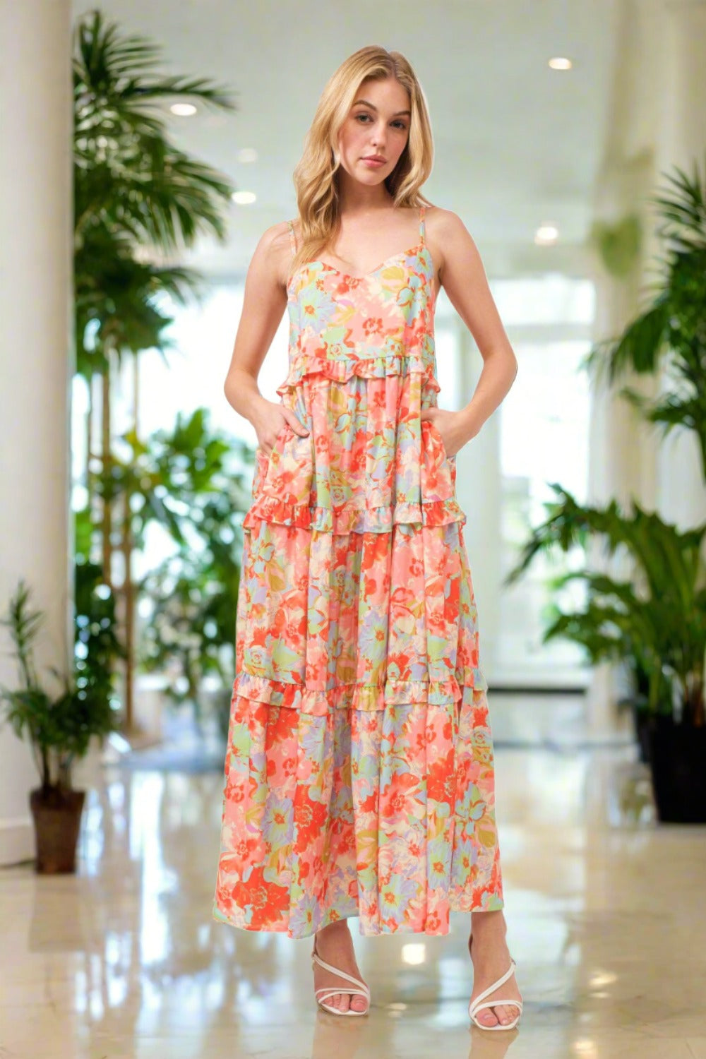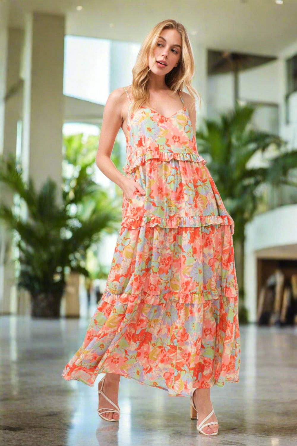The floral ruffled tiered maxi cami dress is a stunning and feminine choice for any special occasion. With its floral print and tiered design. this dress exudes elegance and romance. The ruffled tiers add movement and depth to the dress. creating a whimsical and ethereal look. Perfect for weddings. parties. or summer outings. this dress is both beautiful and versatile. Embrace your romantic side and shine in the floral ruffled tiered maxi cami dress for a captivating and elegant ensemble. Elevate your wardrobe with this enchanting dress that will make you feel like a vision of beauty wherever you go.
