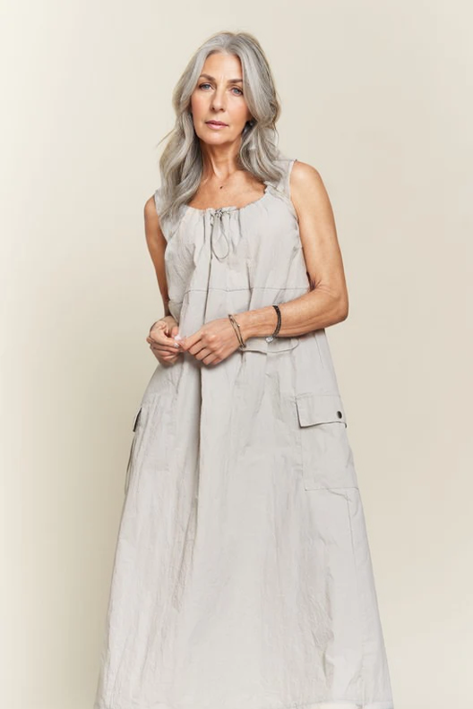 This beige cargo midi dress features a drawstring waist and a slit back for a stylish and adjustable fit. The cargo design adds a touch of functionality. making it perfect for both casual and formal occasions. Stay comfortable and chic in this versatile dress.