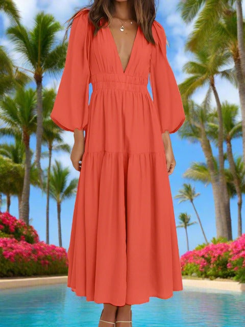 Enthüllen Sie Ihren Bohème-Geist mit unserem Boho-Maxikleid mit Ballonärmeln für den Strandurlaub. Dieses Kleid kombiniert entspannten Urlaubscharme mit strandtauglicher Eleganz. Das Maxikleid hat voluminöse Ballonärmel, die die Essenz des unbeschwerten Boho-Stils einfangen. Die fließende Maxilänge verleiht ein Element der Eleganz. Damit ist es die ideale Wahl für Ihre Eskapaden am Meer oder im Urlaub. Tauchen Sie ein in die Boho-Stimmung und werten Sie Ihre Strandgarderobe mit diesem mühelos schicken Maxikleid auf.