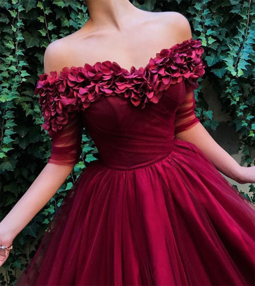 Burgundy Off the Shoulder Half-Sleeve A-line Tulle Long Pom Dresses. MP429