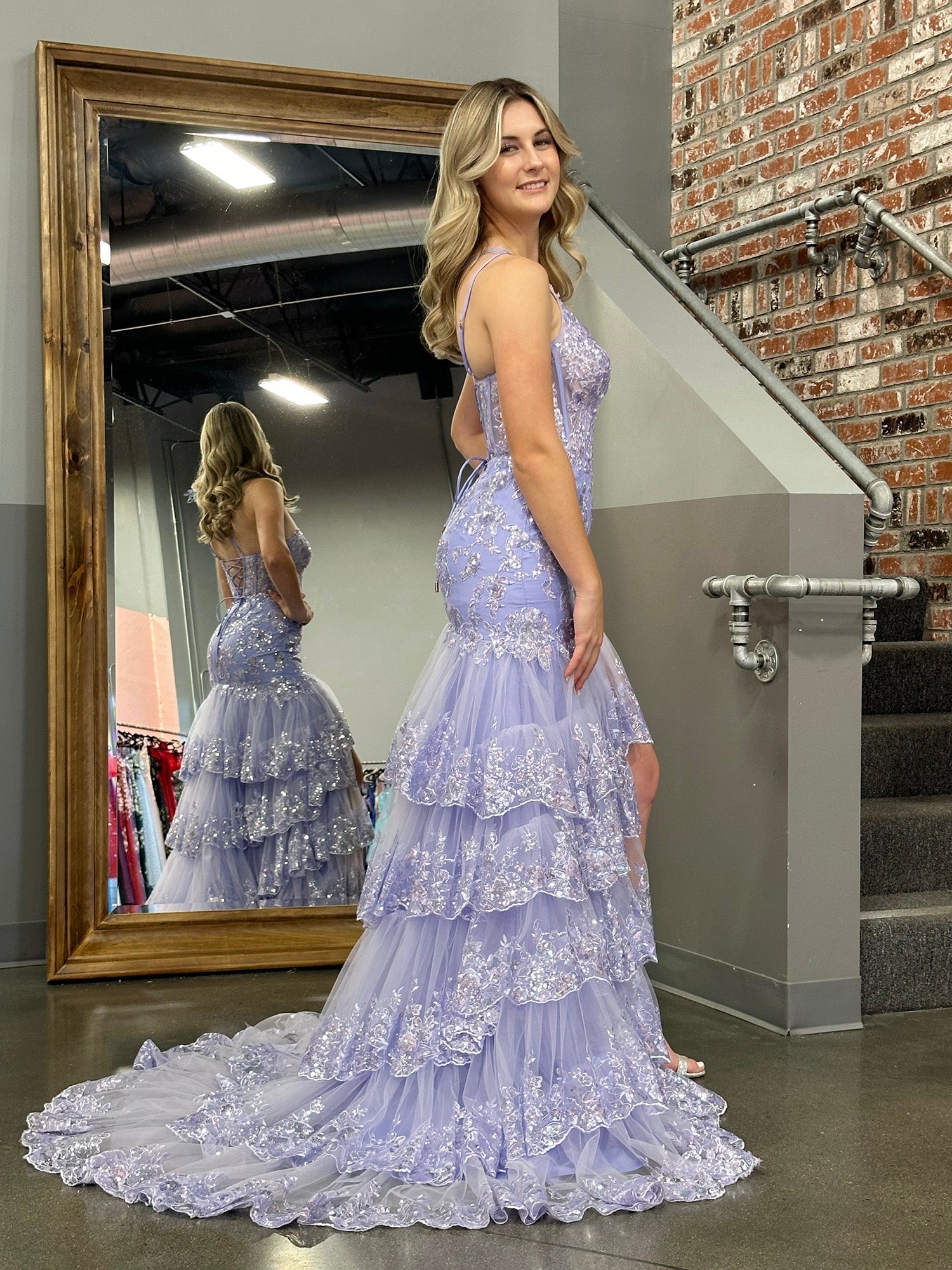 Step into a world of elegance and allure with Andrea's breathtaking floor-length sheath dress that promises a memorable night. Crafted in sumptuous sequined lace and tulle fabric. this gown offers a rich texture and a captivating shimmer. The one-shoulder neckline adds a dash of modern sophistication. perfect for framing your favorite pendant or statement earrings. Tiered ruffles cascade gracefully down the gown. adding romantic flair. while the daring slit ensures you move with unrestricted grace.