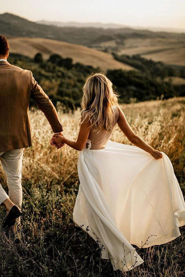 Chiffon Floral Lace Round Neck Floor Length Beach Wedding Dresses.