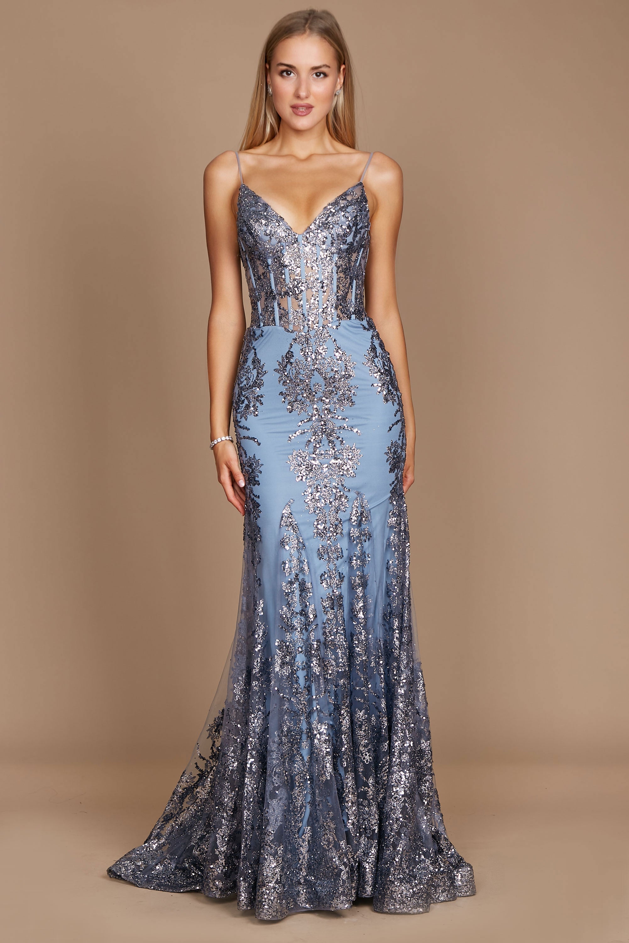 With this alluring spaghetti strap corset dress. get ready to shine and steal the spotlight. It's the ideal option for your special occasion because it was created to highlight your contours. This Fitted Long Formal Corset Prom Dress is a classic treasure because to the magnificent long length and our traditional fit and flare style. Your body is highlighted by the tight bodice and plunging V-neckline. which flow into a sophisticated skirt with magnificent dazzling embellishments. In this long. form-fitting prom dress that oozes class and charm. dance the night away. In this alluring gown. you'll feel like a true star. destined to create priceless memories.