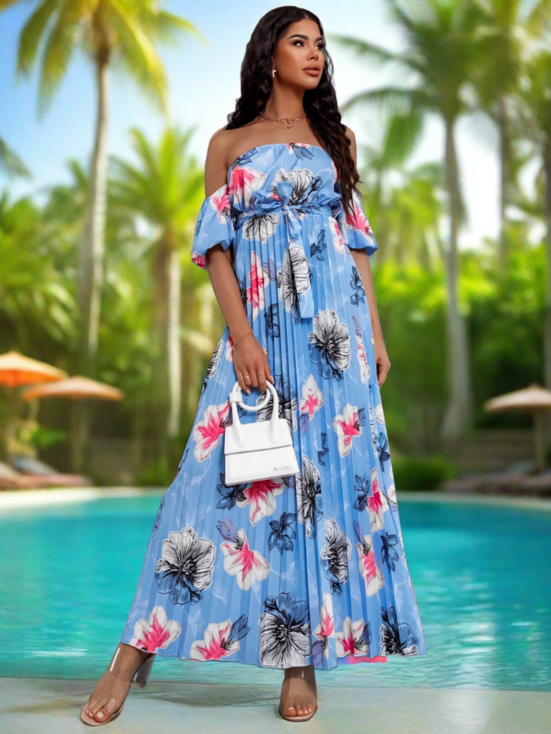 Love this Off Shoulder floral Resort Maxi Dress for a tropical resort vacation in Hawaii or the Bahamas! Tie waist floral Maxi dress is comfortable and perfect for your summer vacation.