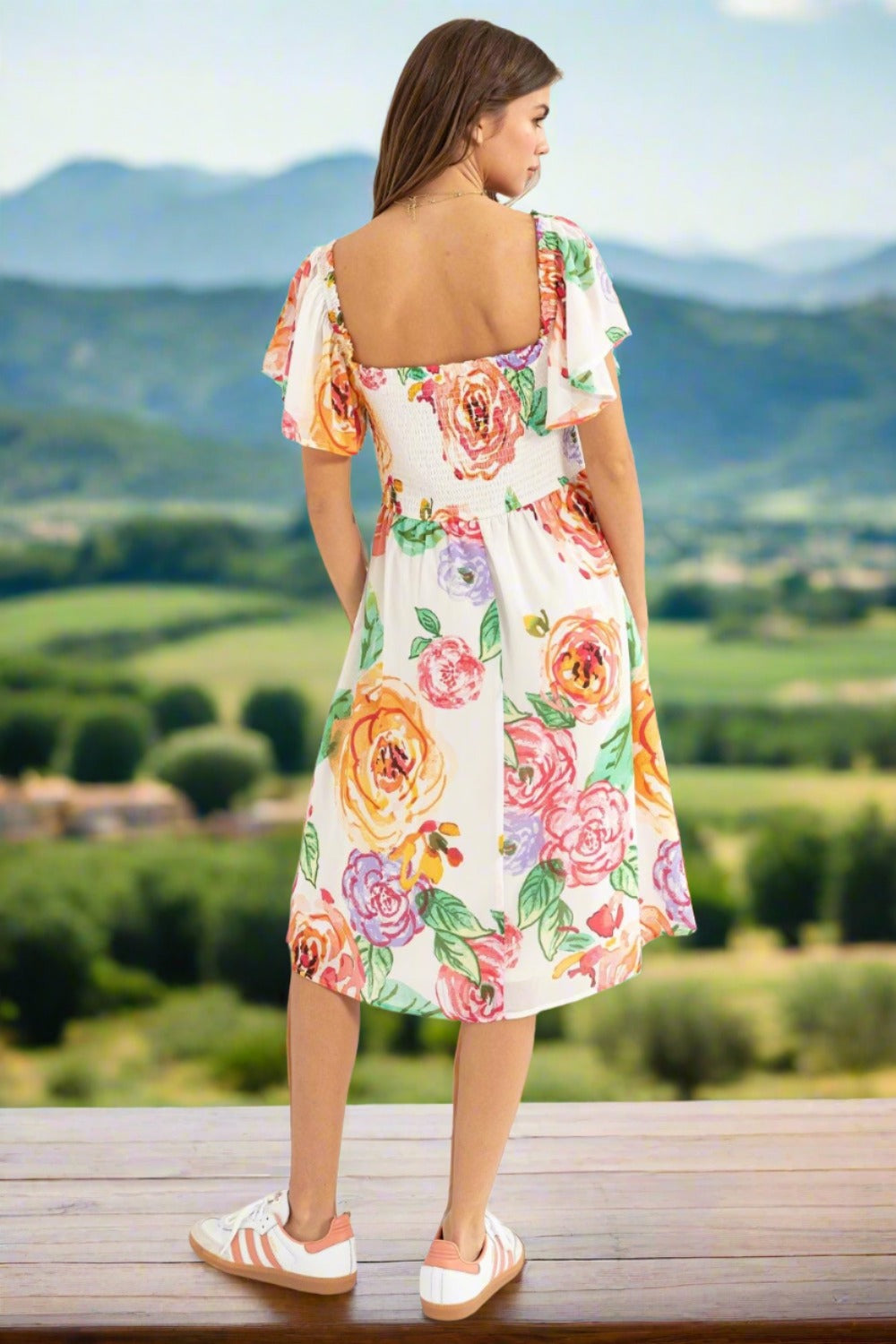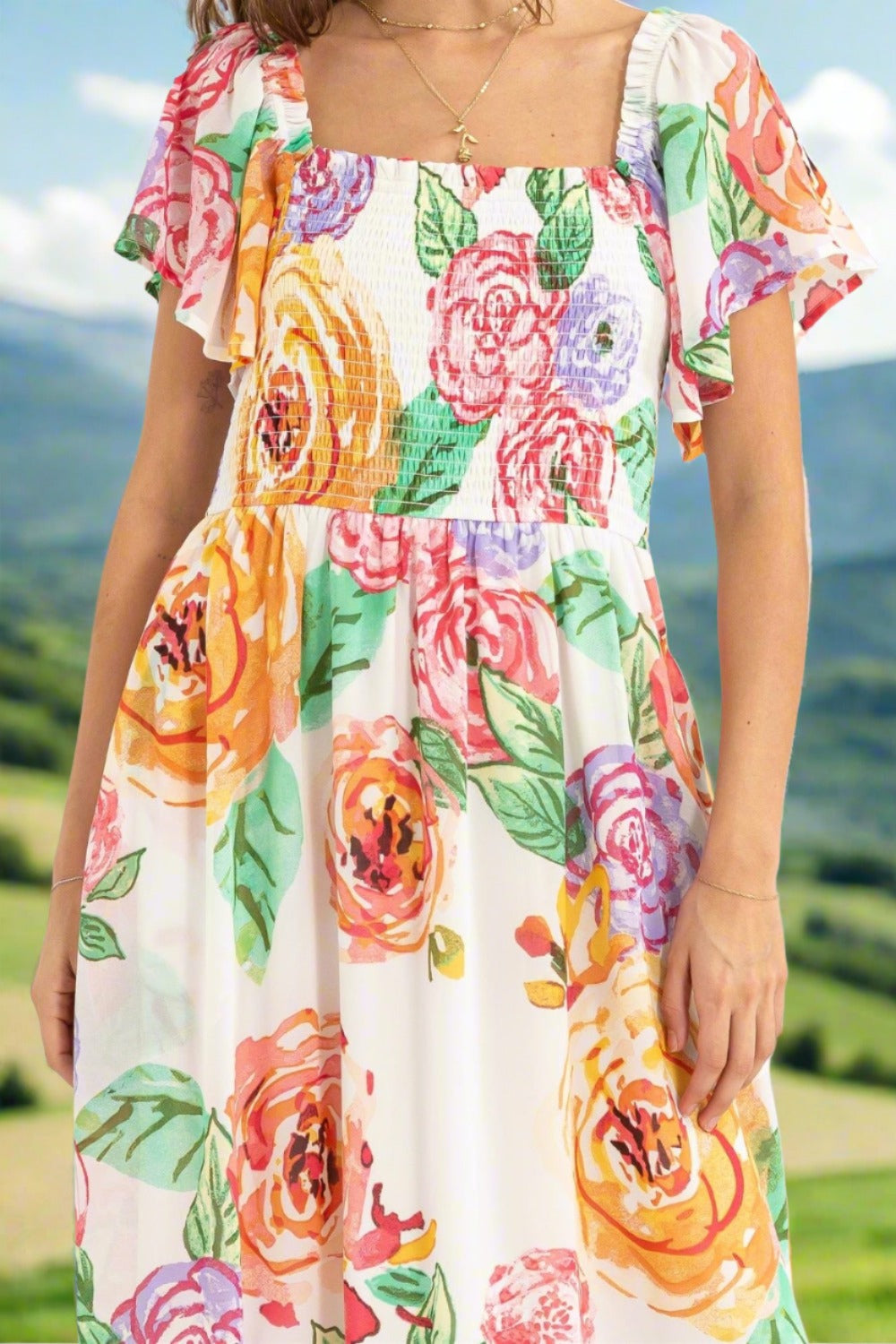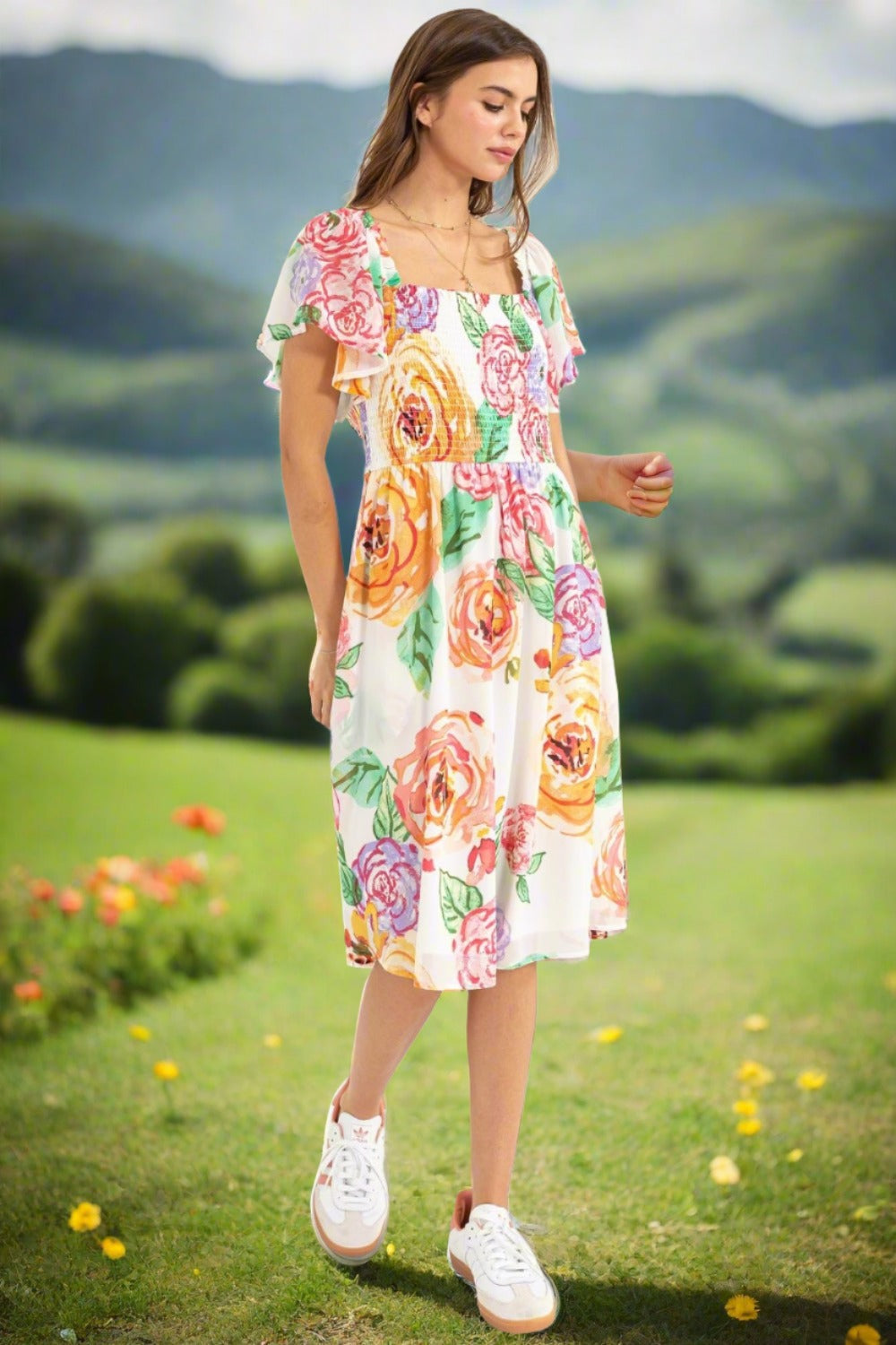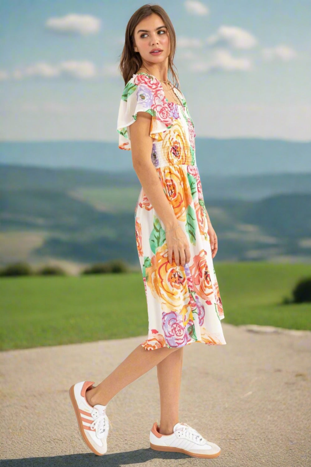 The Floral Flutter Sleeve Resort Dress is a romantic and feminine choice for any occasion. Featuring delicate floral patterns and flutter sleeves. this dress exudes soft and graceful charm. The smocked waistline creates a flattering silhouette while providing comfort and flexibility. Perfect for a casual day out or a special event. this dress offers versatility and style. Pair it with heels for a dressier look or sandals for a more relaxed vibe. Embrace your romantic side with this lovely floral dress that is sure to turn heads wherever you go.