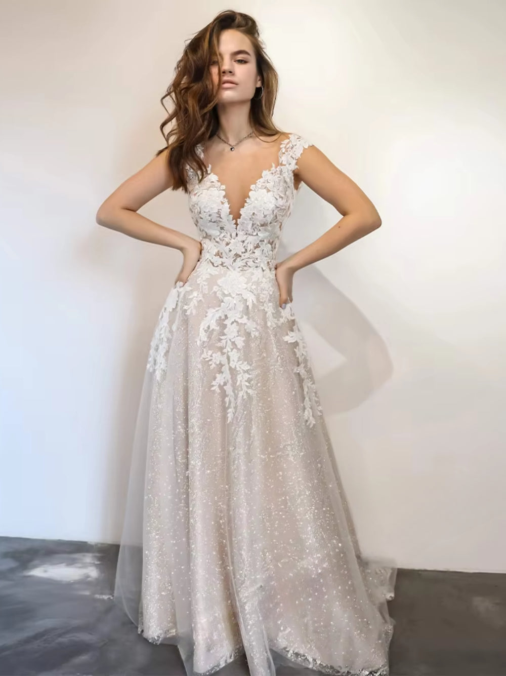 Lace A-line V-neck Sleeveless Sweep Train Wedding Dress. Bridal Gowns. MW542