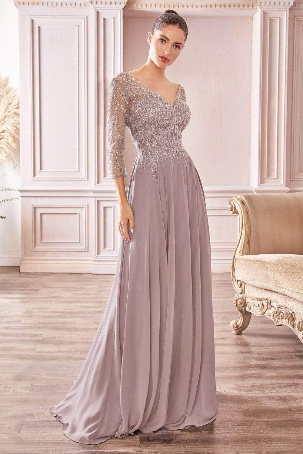 Wear this luxurious creation by Ladivine CD0171 to flaunt your refined style. This formal evening gown in soft chiffon fabric has a full A-line silhouette. The dress has a portrait V-neckline. sheer quarter-length sleeves. and a sweetheart-lined bodice with sparkly stone accents. The skirt has delicate gathers from the natural waist and flows gracefully down to the floor with a subtle sweep train. Wearing this noticeably elegant style by Ladivine CD0171. you are all set to fascinate everyone on that special occasion. The models are dressed in Smoky Blue. Mauve. and Dusty Rose. Find more mother of the bride dresses.