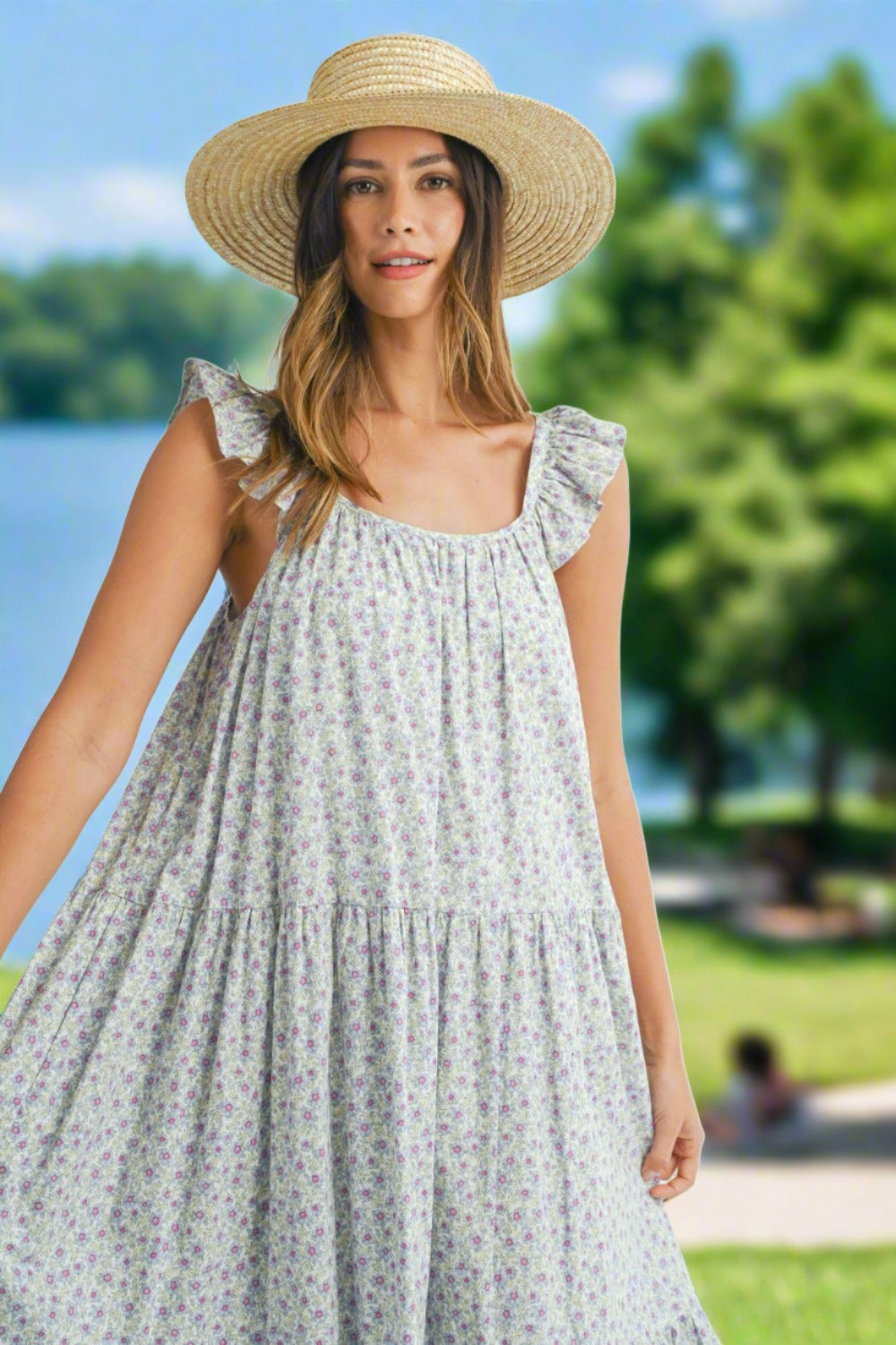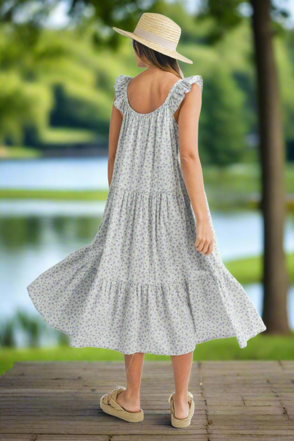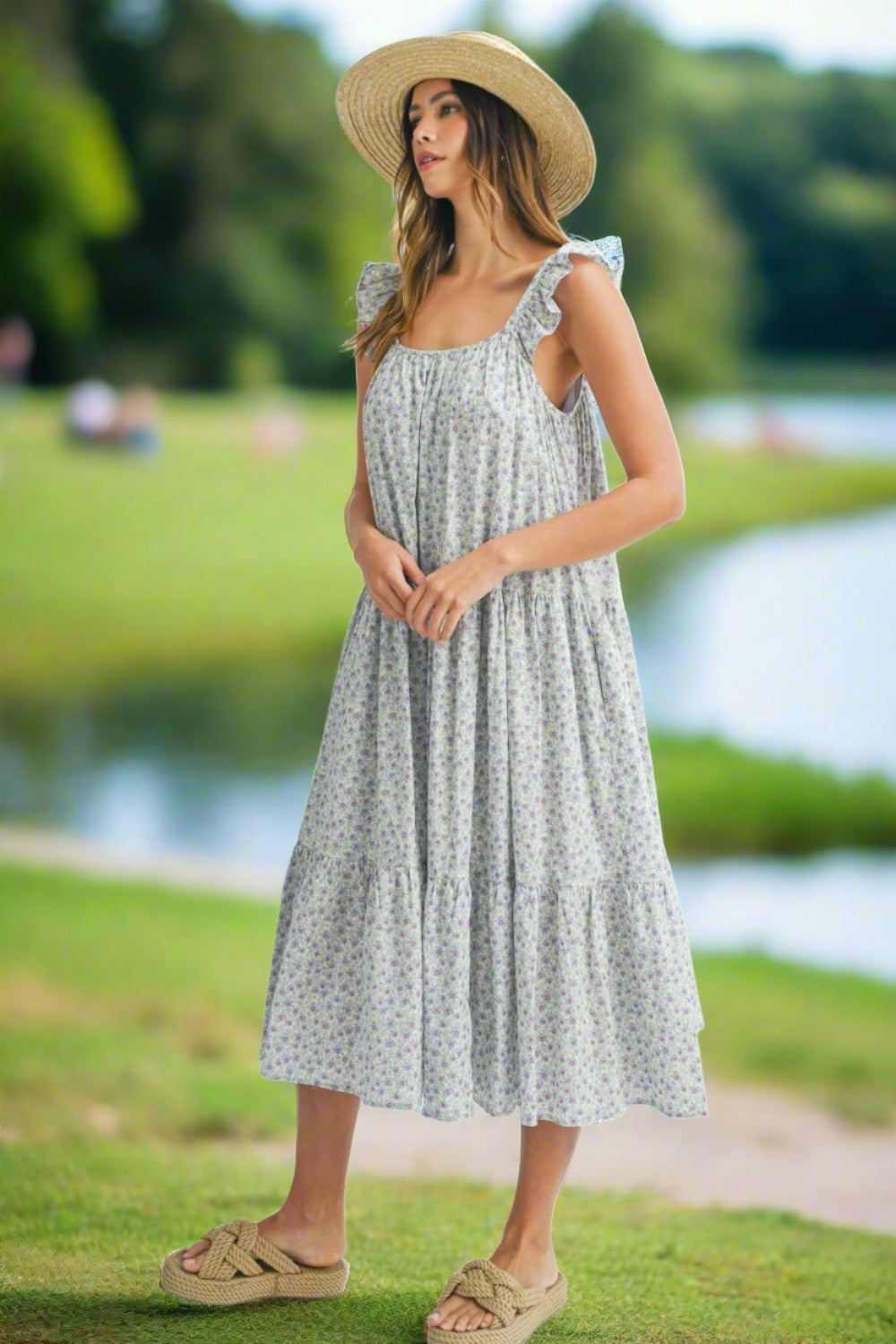 Elevate your summer style with our Light Blue Floral Ruffle Shoulder Summer Midi Dress. Featuring charming floral prints and delicate ruffle shoulder details. it's perfect for summer picnics. Enjoy breezy comfort and feminine elegance in this versatile midi dress. Shop all Women's Summer Dresses.