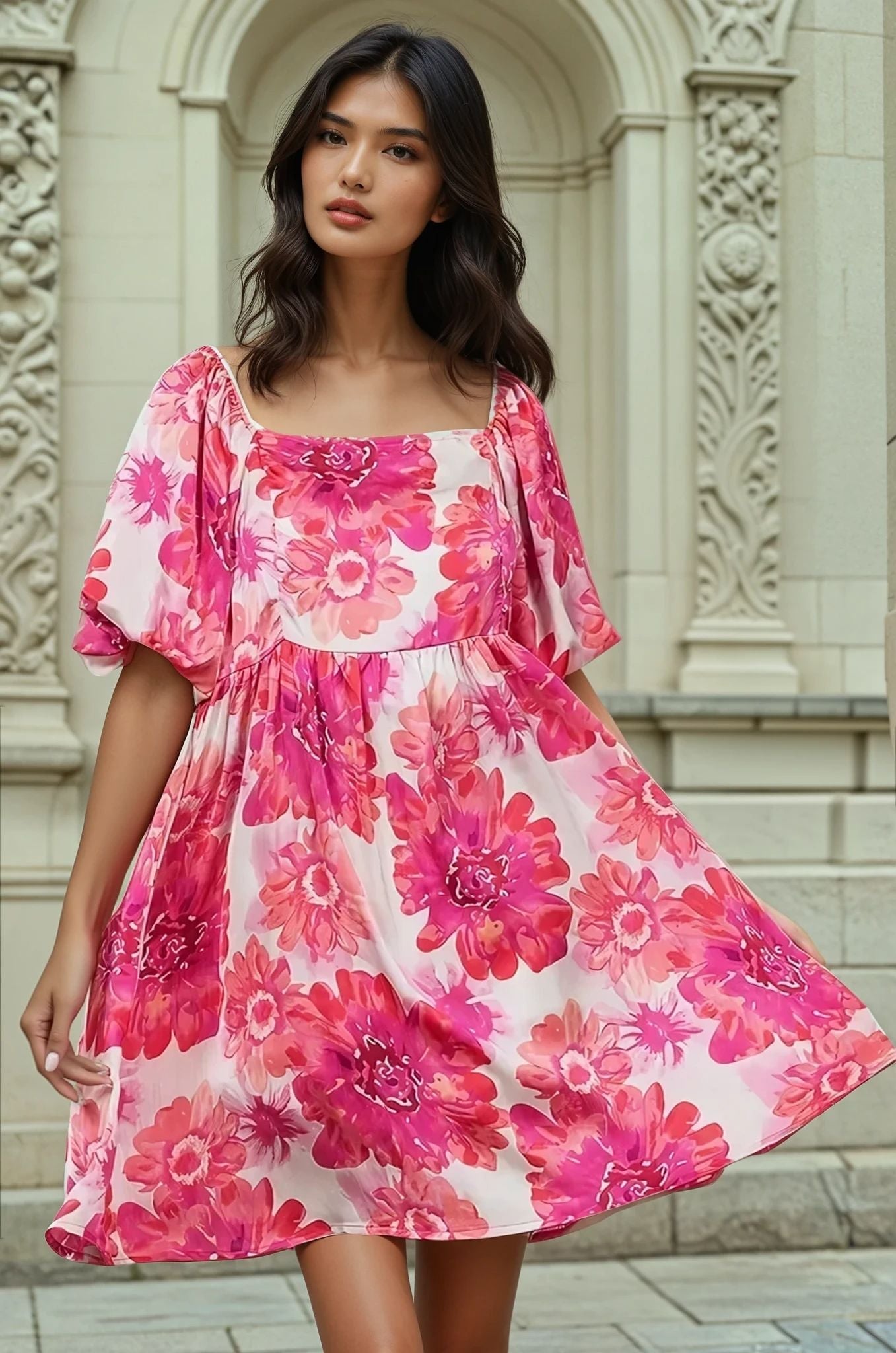 This Pink Floral Square Neck Puff Sleeve Mini Summer Dress is the perfect addition to your wardrobe. With its elegant square neckline and puff sleeves. it's perfect for any occasion. whether it's a wedding reception or a casual lunch date. Its light and flowy material make it perfect for the summer season. Elevate your style with this beautiful dress.