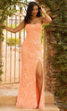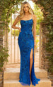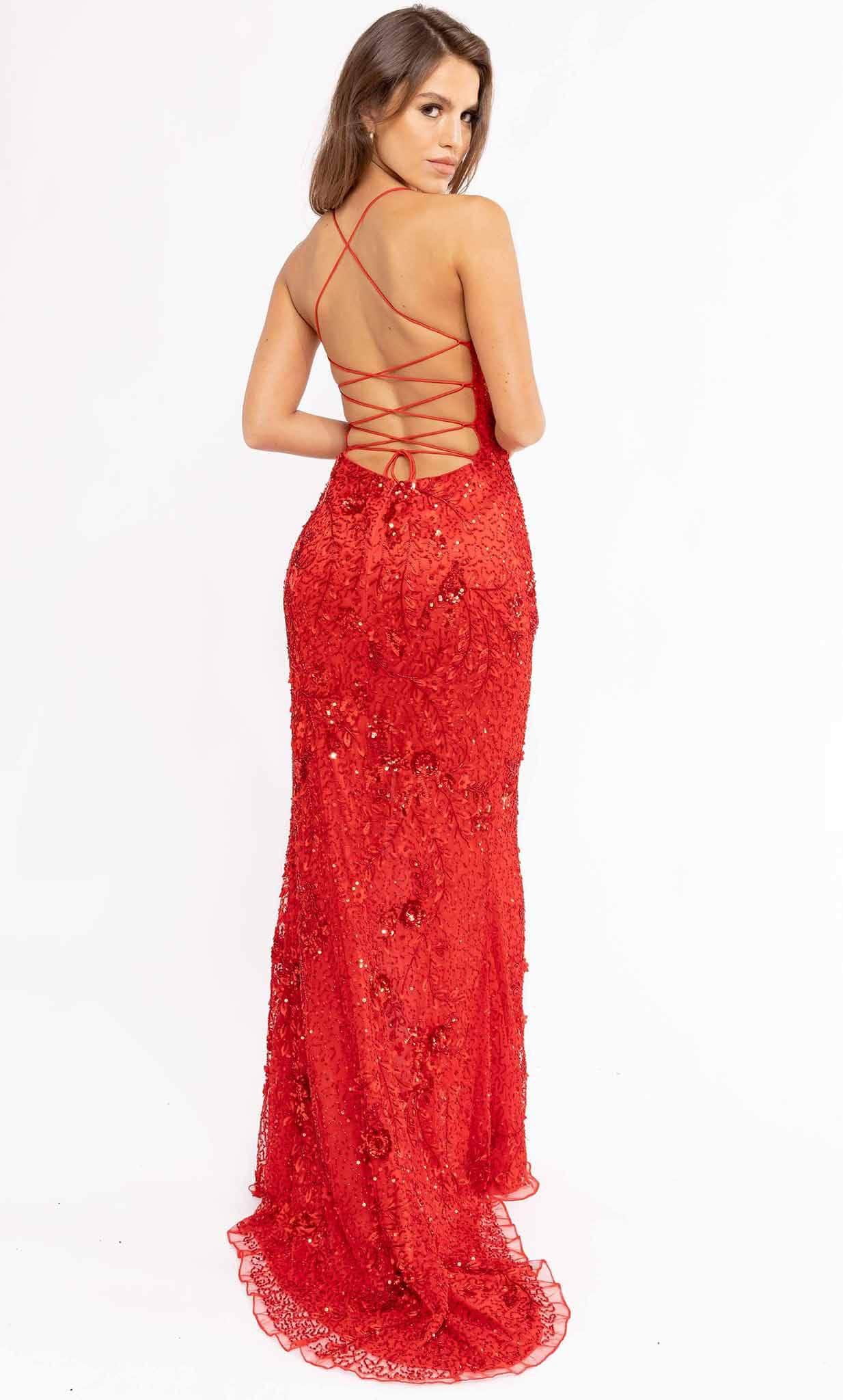Make yourself into a vision of loveliness in this spectacular full length gown by Primavera Couture 3931. Adorned with dazzling beadworks. floral sequins and leaf appliques. this eye-catching look displays a flattering scoop neckline and spaghetti straps. The daring back is bare and has a lace-up tie design for a customized fit. Flaunting a thigh-high leg slit. the sheath skirt elegantly skims into a full length hem and sweeping train. This Primavera Couture 3931 masterpiece will let you celebrate that divine feminine beauty. Models are wearing the Black. Bright Blue. Coral. Ivory. Red and Royal Blue colors.
