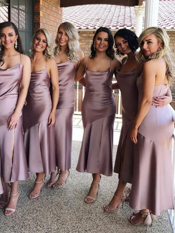 Satin Sheath Spaghetti Straps Cowl Neck Tea-length Bridesmaid Dresses. MBD273