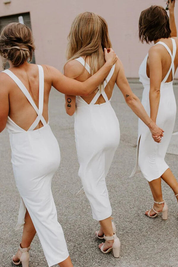 Satin Sheath V-neck Tea-Length Bridesmaid Dresses With Slit.