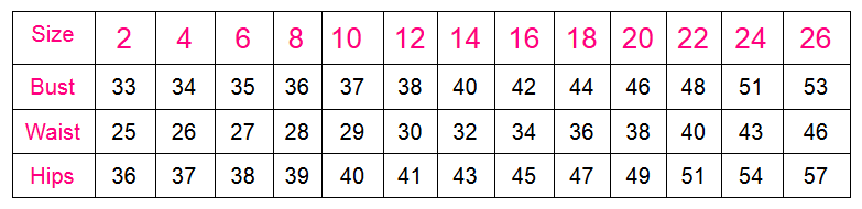 Sizes : 2. 4. 6. 8. 10. 12. 14. 16. 18. 20. 22. 24