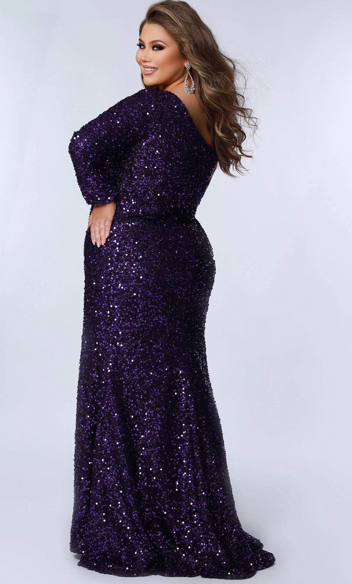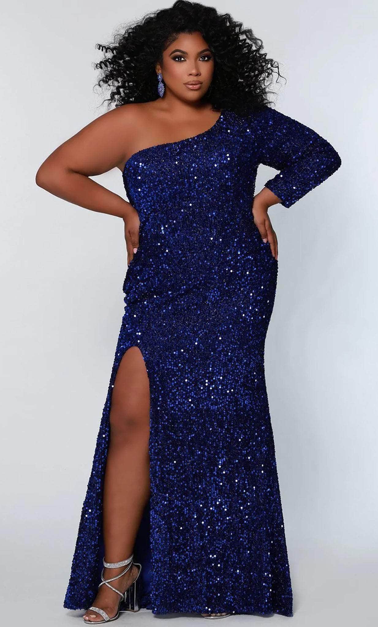Shimmer and shine in an ethereal creation from Sydney's Closet SC7319. This fully sequined dress showcases an asymmetric neckline. one shoulder long sleeve and a slanted mid-open zipped up back. Accented with a front side slit. the skirt flows into a full-length sheath silhouette. Turn into such an irresistible vision that captures everyones interest in this Sydney's Closet masterpiece. Each Sydney's Closet design is unique and trendy which is specifically tailored to fit the curves gracefully. Hence. from Sydney's Closet cocktail dresses. to Sydney's Closet plus size prom dresses. size of apparel will be perfect to a real curvy body. Models are wearing the Onyx. Sapphire. Ruby and Pearlescent colors.