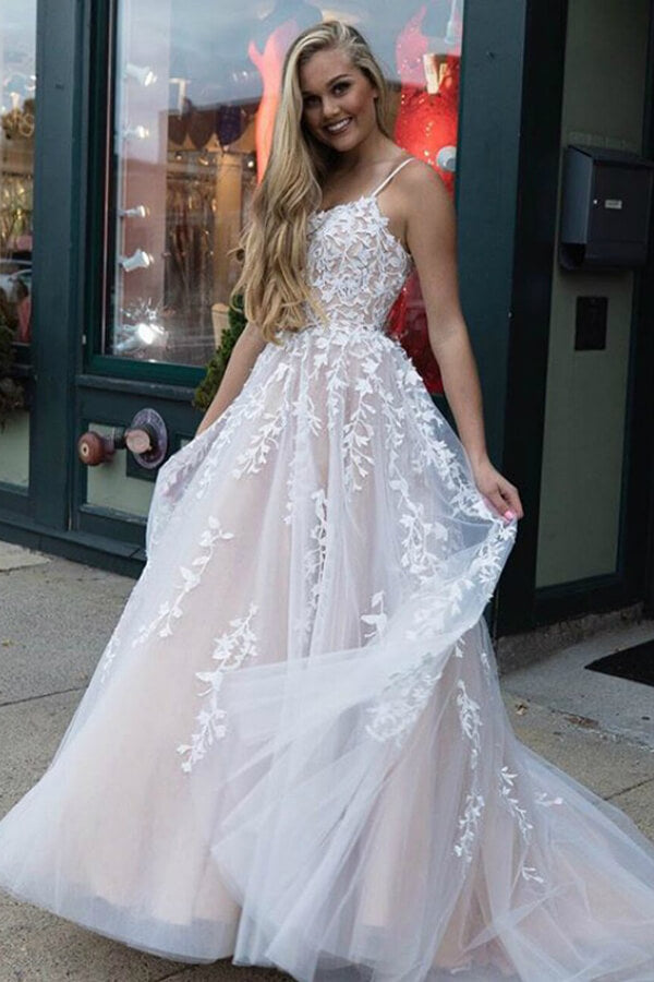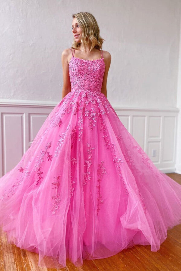 Yellow Tulle Spaghetti Straps Scoop A-Line Prom Dresses with Appliques.