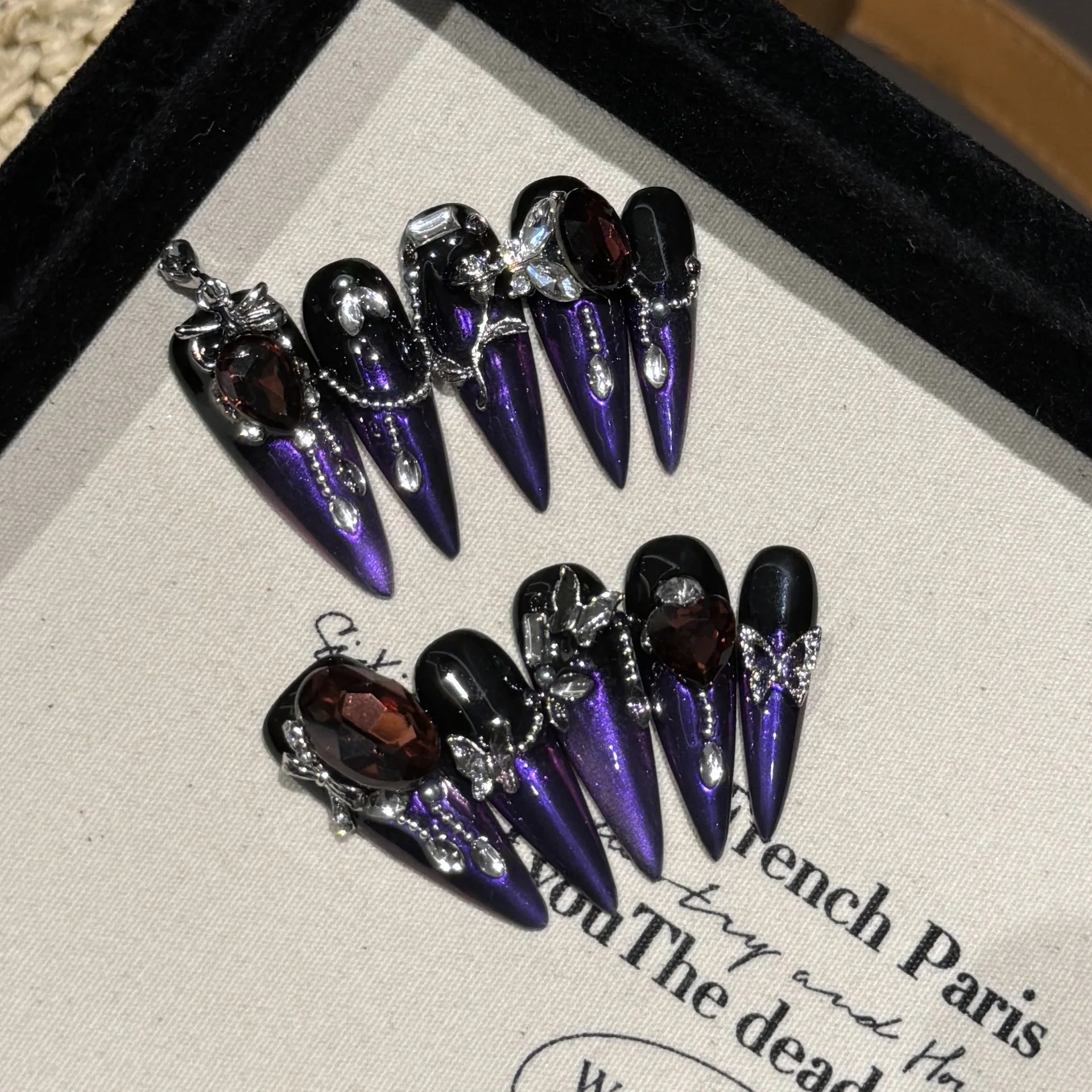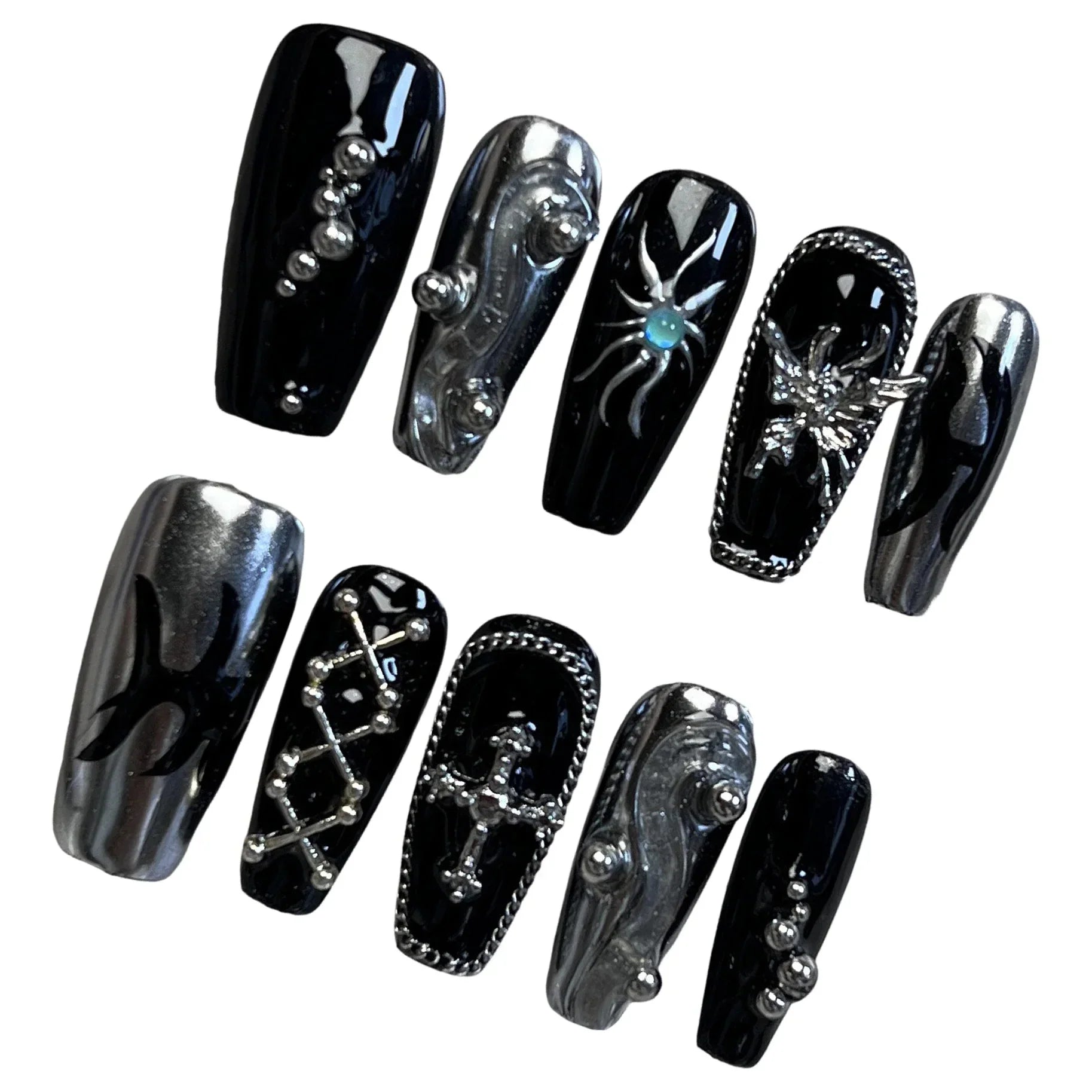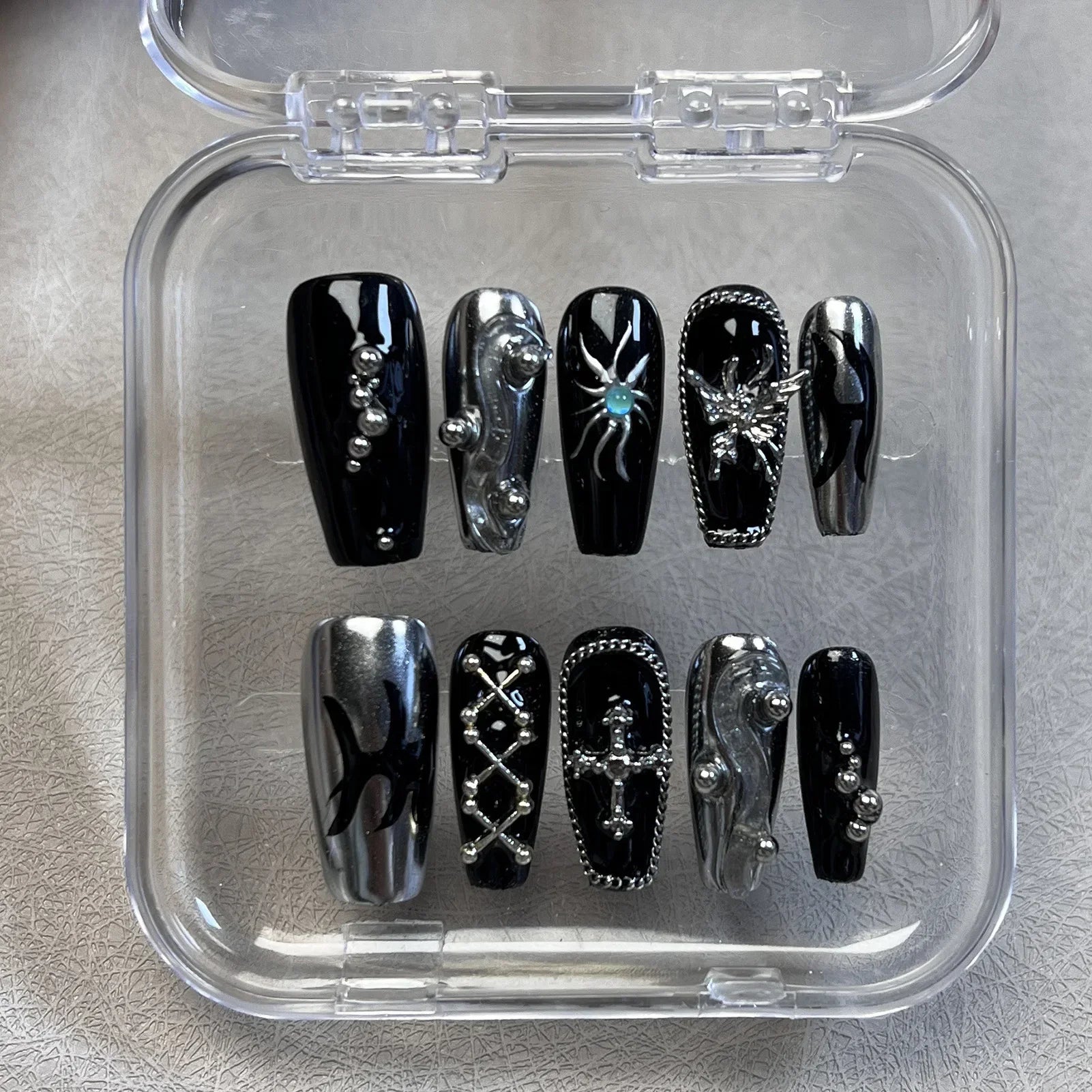 10pcs Punk Style Handmade Fake Nails Y2k Black Sliver Metal Chain Decors Press On Nails Medium Coffin Detachable Manicure Art