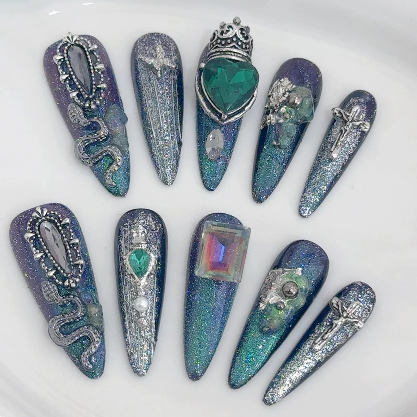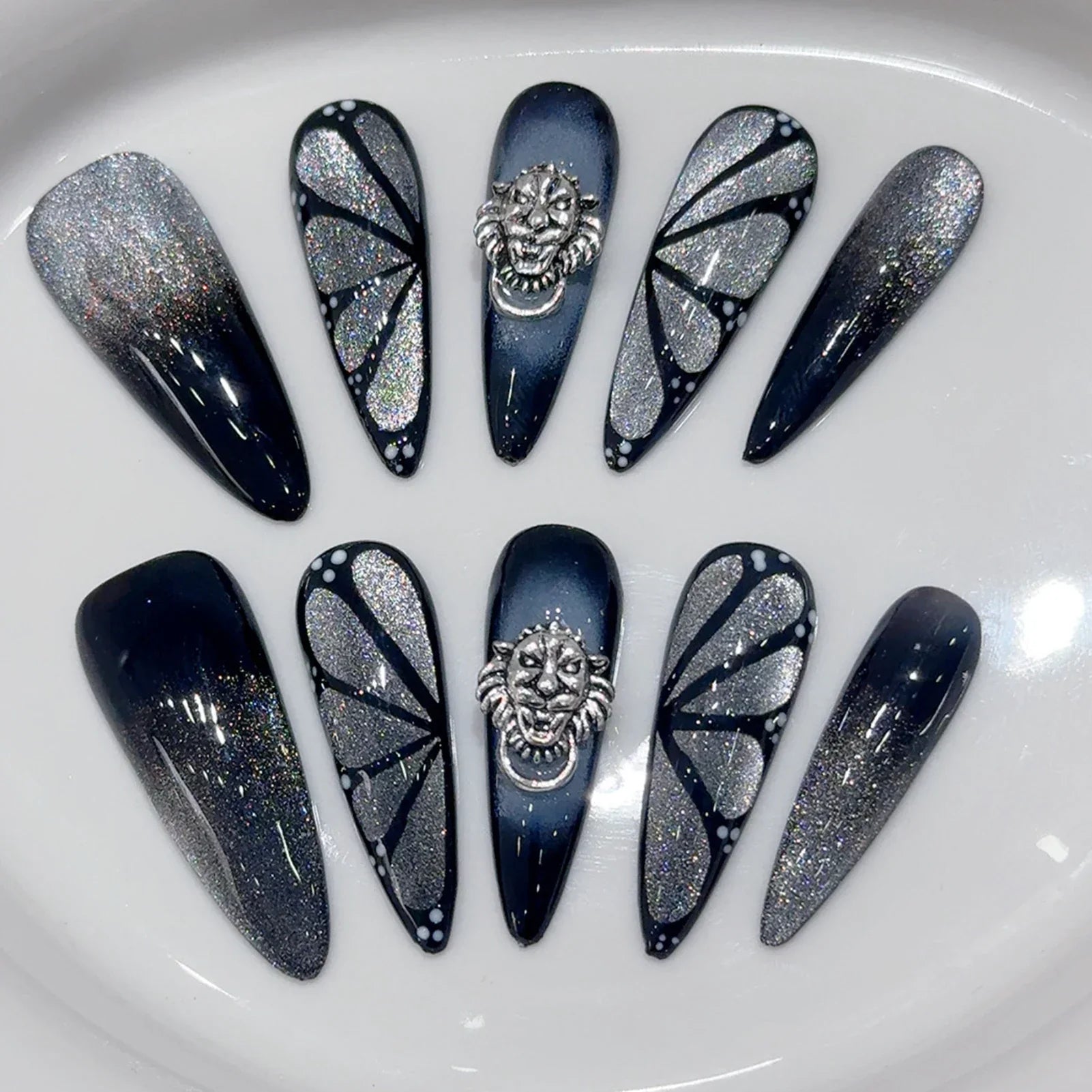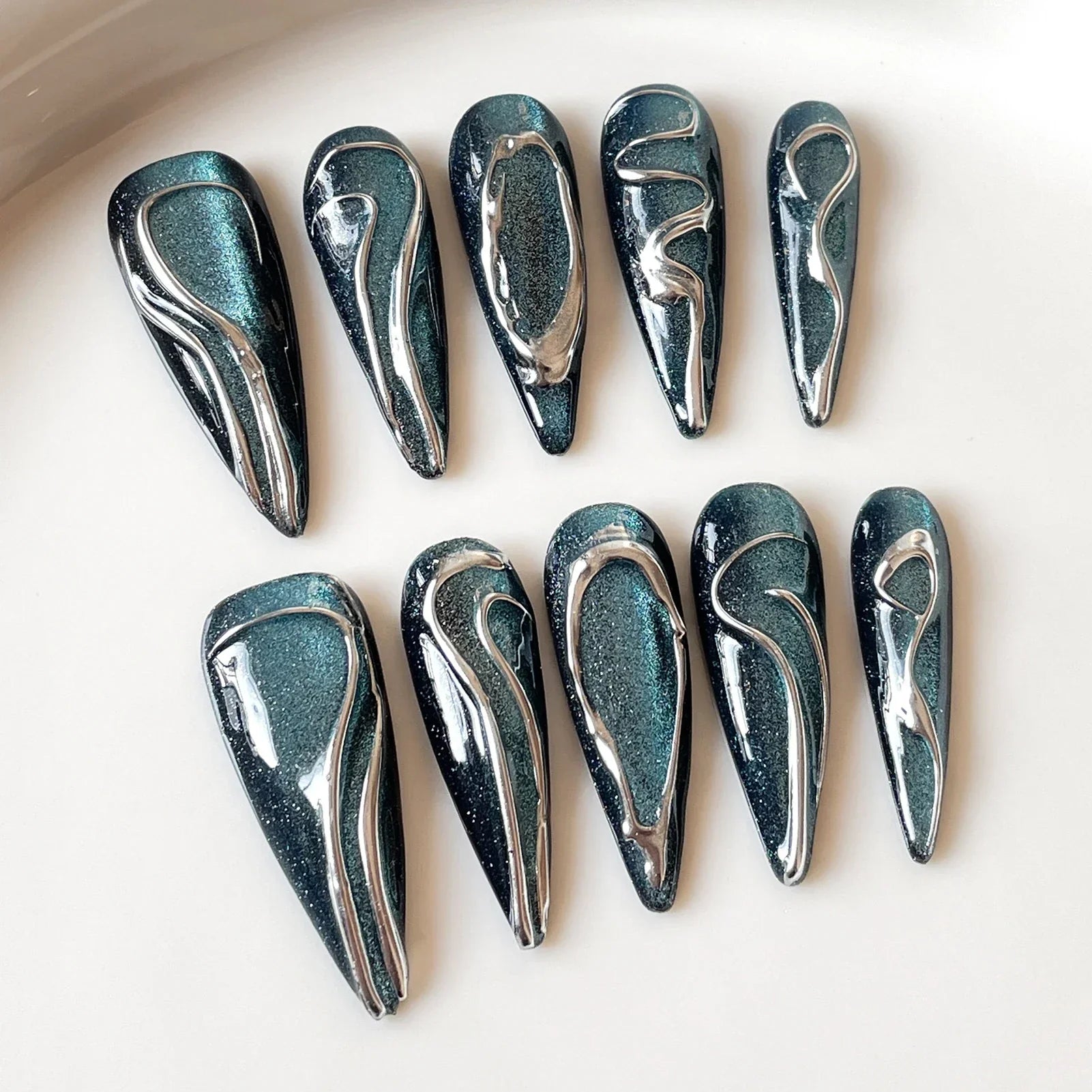 10pcs Punk Style Press On Nails Handmade Long Stiletto Y2k Fake Nail Tips Glossy Grey Fake Nail Patches With Metal Stripe Decor