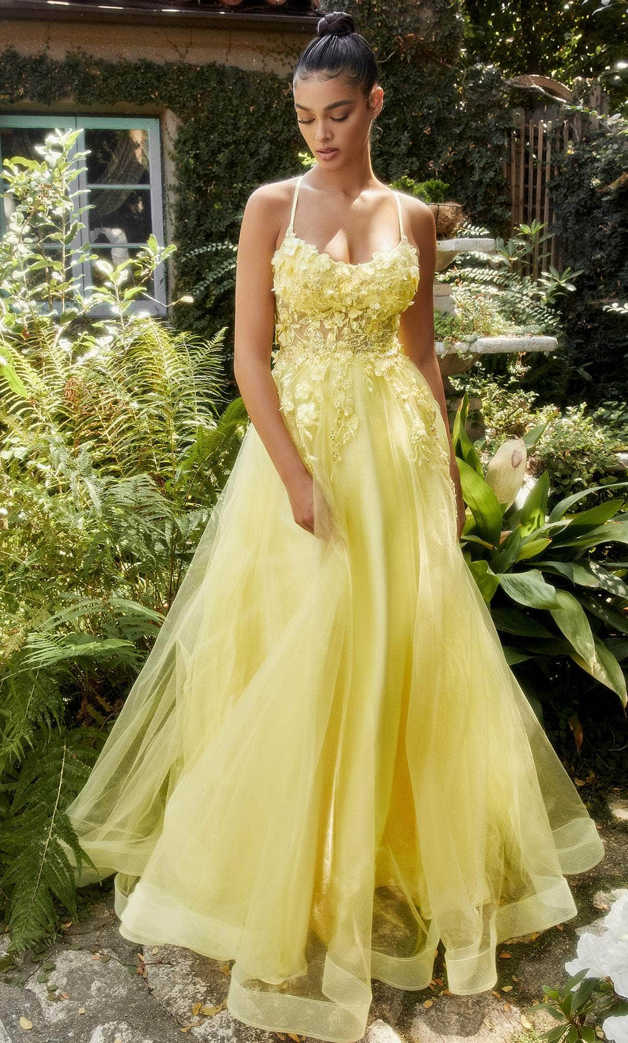 You are more than gorgeous when you wear this unbeatable creation from Andrea and Leo A1142. This captivating sleeveless gown is decorated with 3D floral appliques. embroidery and sparkly beads on the illusion bodice down to the top skirt. It boasts a scoop neckline with spaghetti straps that go across and lace up at the back. The skirt sculpts an A-line silhouette that trickles down into a full length hem and sweeping train. Unleash an inner glamour that attracts all eyes on you in this Andrea and Leo A1142 masterpiece. Models are wearing the Pastel Green. Lavender. Dusty Rose. Yellow and Blue colors.