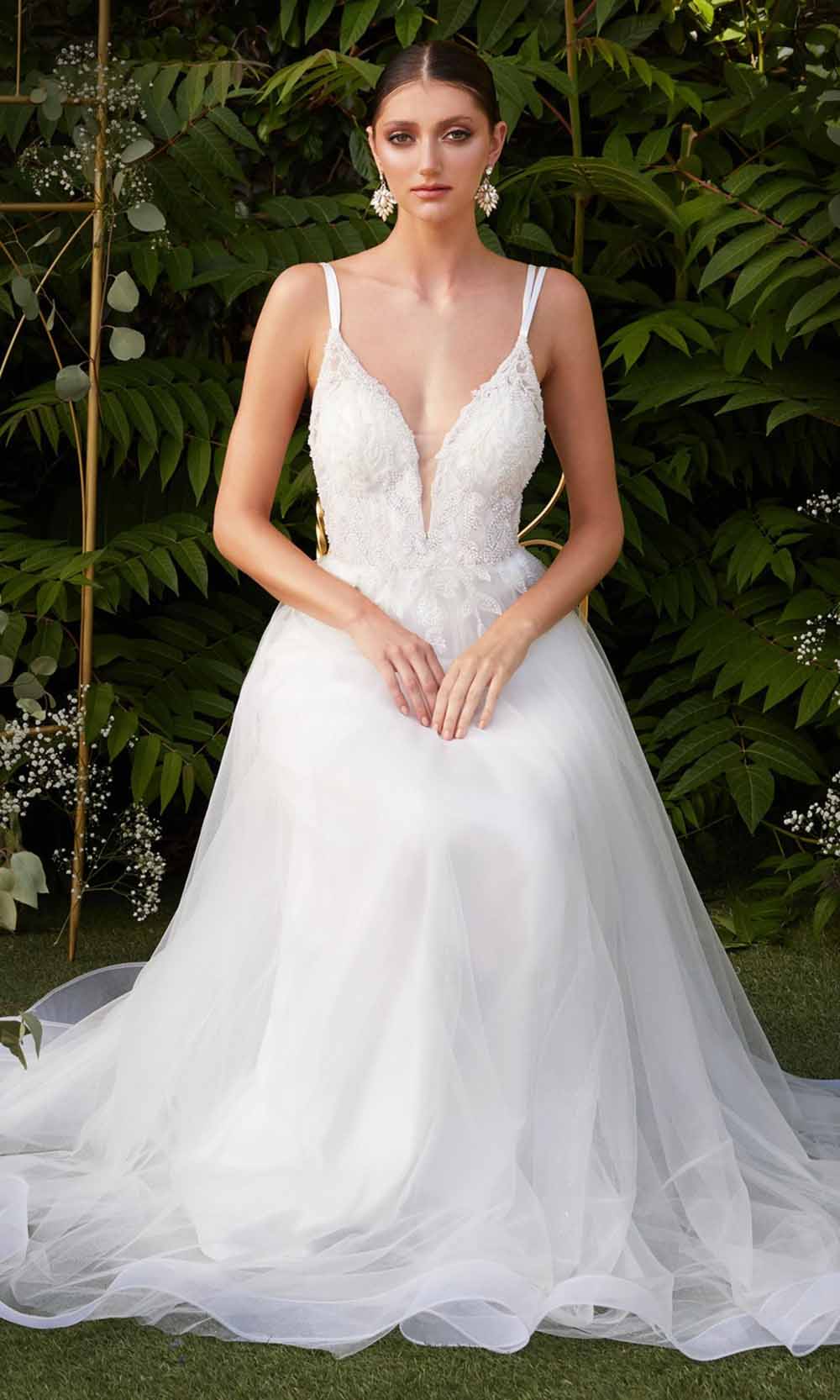 Get ready for everyone to stop and stare when you show up in this Cinderella Divine CD0154W. You'll love twirling around in this floor length A-line gown that features a beaded applique bodice and layered tulle skirt. The sleeveless spaghetti strap bodice and open strappy back will show your flawless shoulders and back. Fascinate the crowd wearing this Cinderella Divine masterpiece.