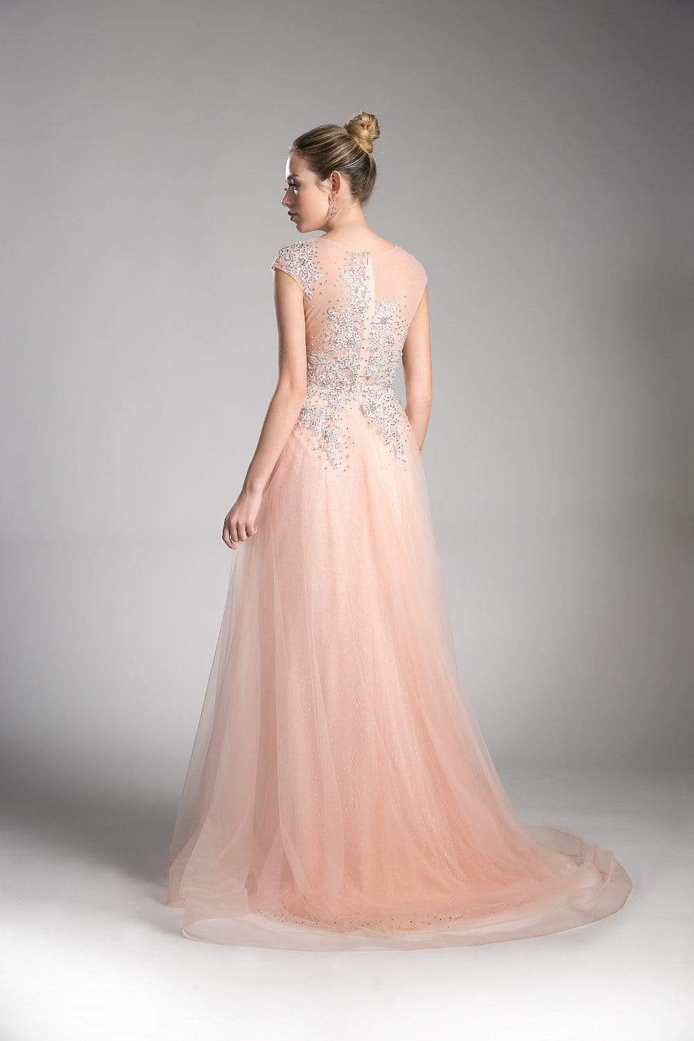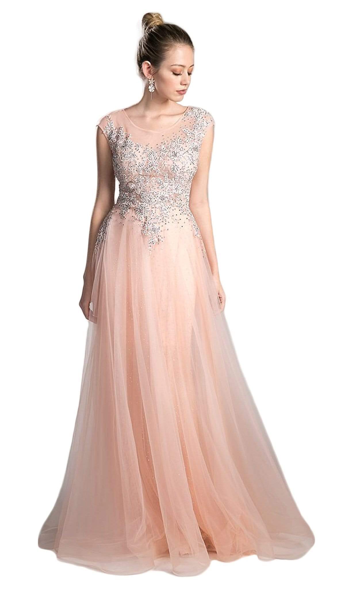 Look glamorously beautiful in this Cinderella Divine 8992 evening gown. This stunner features an illusion bodice adorned with amazing appliques and bead work extended up to the cap sleeve and sheer illusion back. Tailored in tulle. this a-line silhouette dress finishes with an elegant sweep train is a wonderful outfit to any formal events. Have all eyes on you in this sunning Cinderella Divine design.