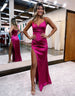 Ariah is the convergence of striking allure and timeless elegance. Draped in luxurious elastic satin. the dress effortlessly captures the spotlight with its vivid hot pink or classic black hue. The sheath silhouette subtly accentuates the figure. as the sleek spaghetti-strapped V neckline frames the collarbone with sophistication. Pleated detailing enriches the bodice. adding depth and dimension. while a confidently placed slit promises an exciting reveal of the leg. turning every step into a graceful dance. Culminating in a floor-length finish with a sweep train. Ariah assures an entrancing exit.