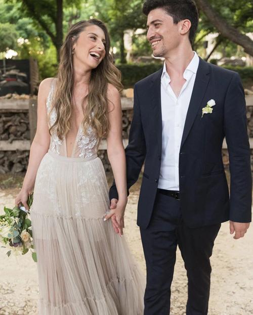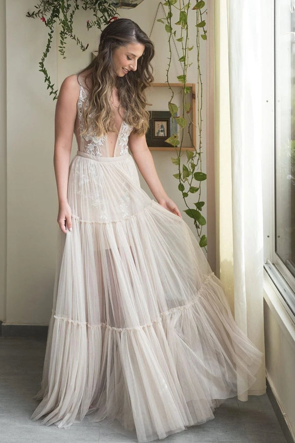 Embroidery A-Line Appliques V-neck Bohemain Tulle Wedding Dress.