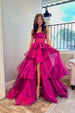 Fuchsia Organza A-line Strapless Ruffle Tiered Prom Dresses With Slit.