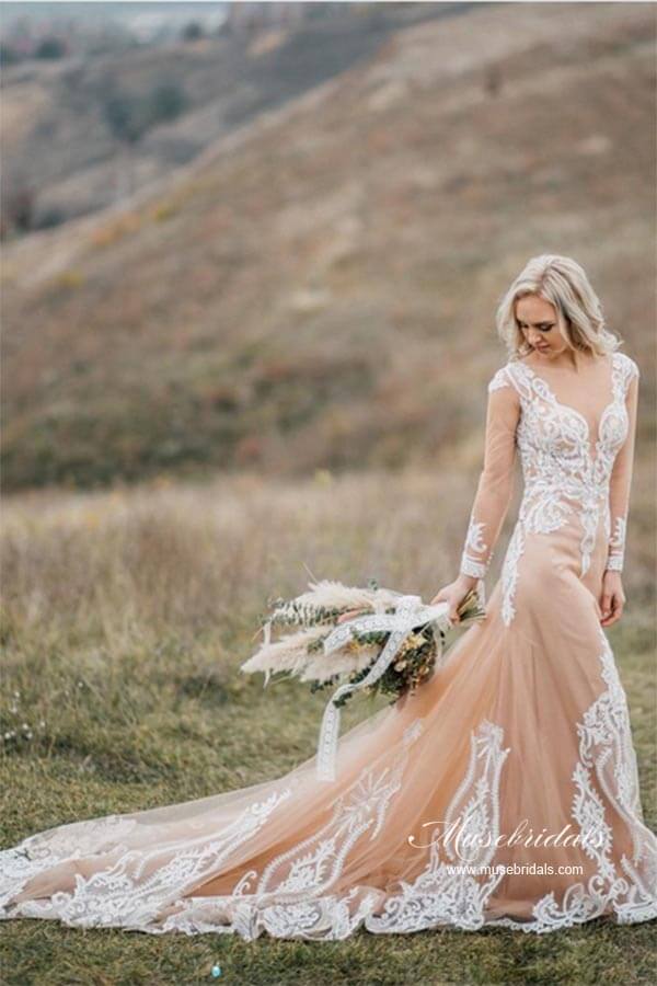 Gorgeous Tulle Mermaid Long Sleeves Wedding Dresses With Appliques. MW967