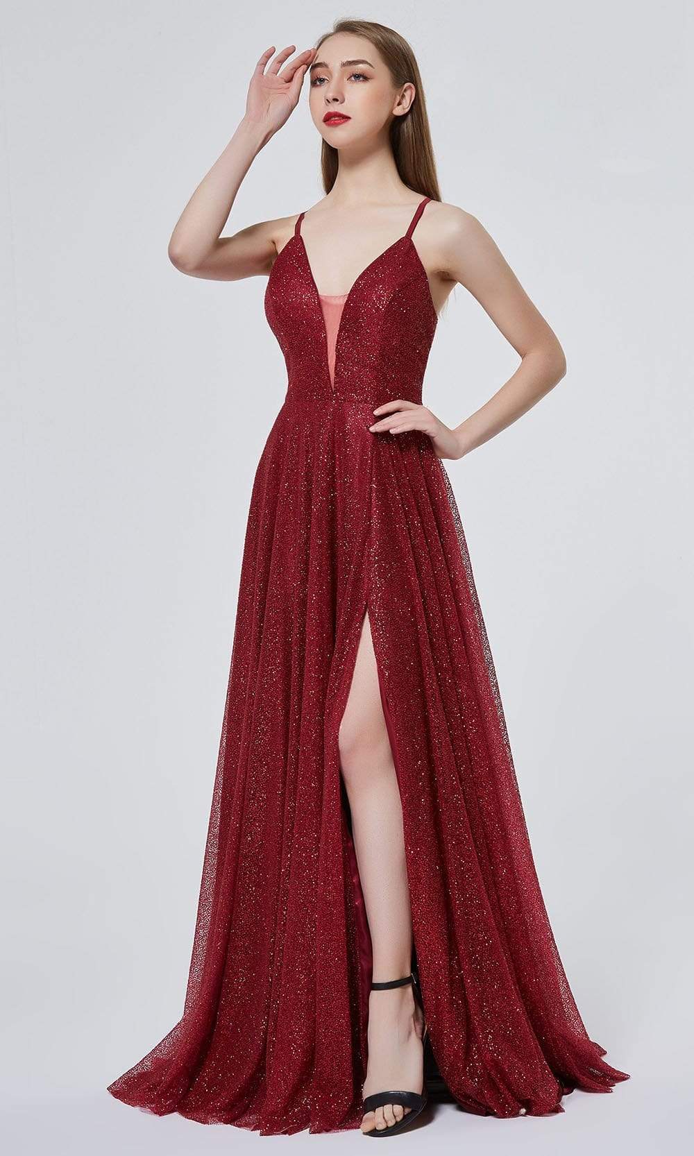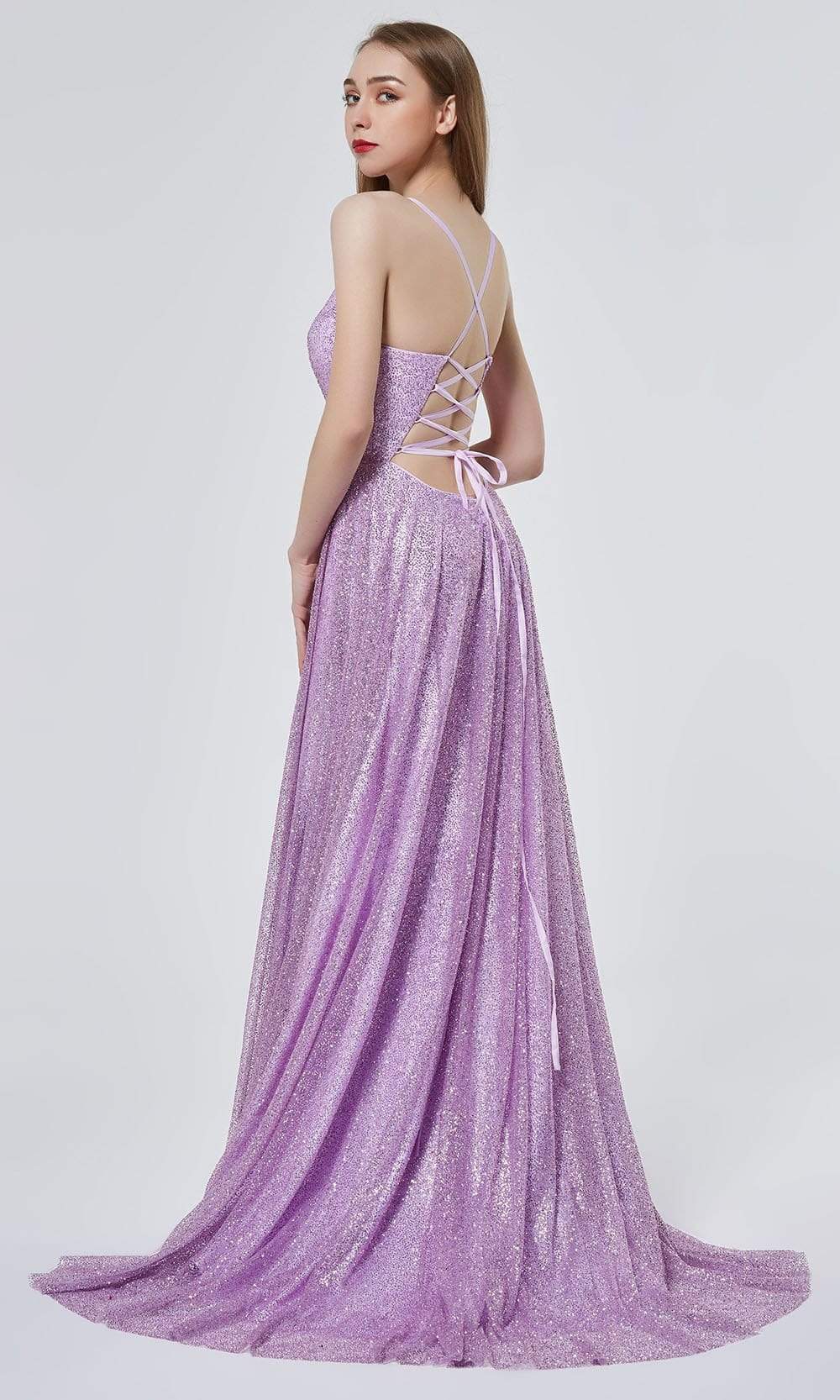 | Details: | Sleeveless. Plunging neckline. Sheer panel. Glitters. Slit. Flowy. Open back. Crisscross. Lace-up tie. Floor length. Sweep train |
