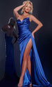 Make your prom fantasies a reality with the unforgettable Jovani 37150 dress. Featuring outstanding tailoring. this gown is crafted from silky fabric that gives it a luminous appearance. while the draped V-neckline and thoughtful ruching perfectly enhance your silhouette. The sheath design flows into a stunning floor-length gown. accentuated by a seductive thigh-high slit and a beautiful train. Embrace sophistication with the luxurious satin Jovani 37150 gown that radiates glamour. Model is wearing the Royal color.