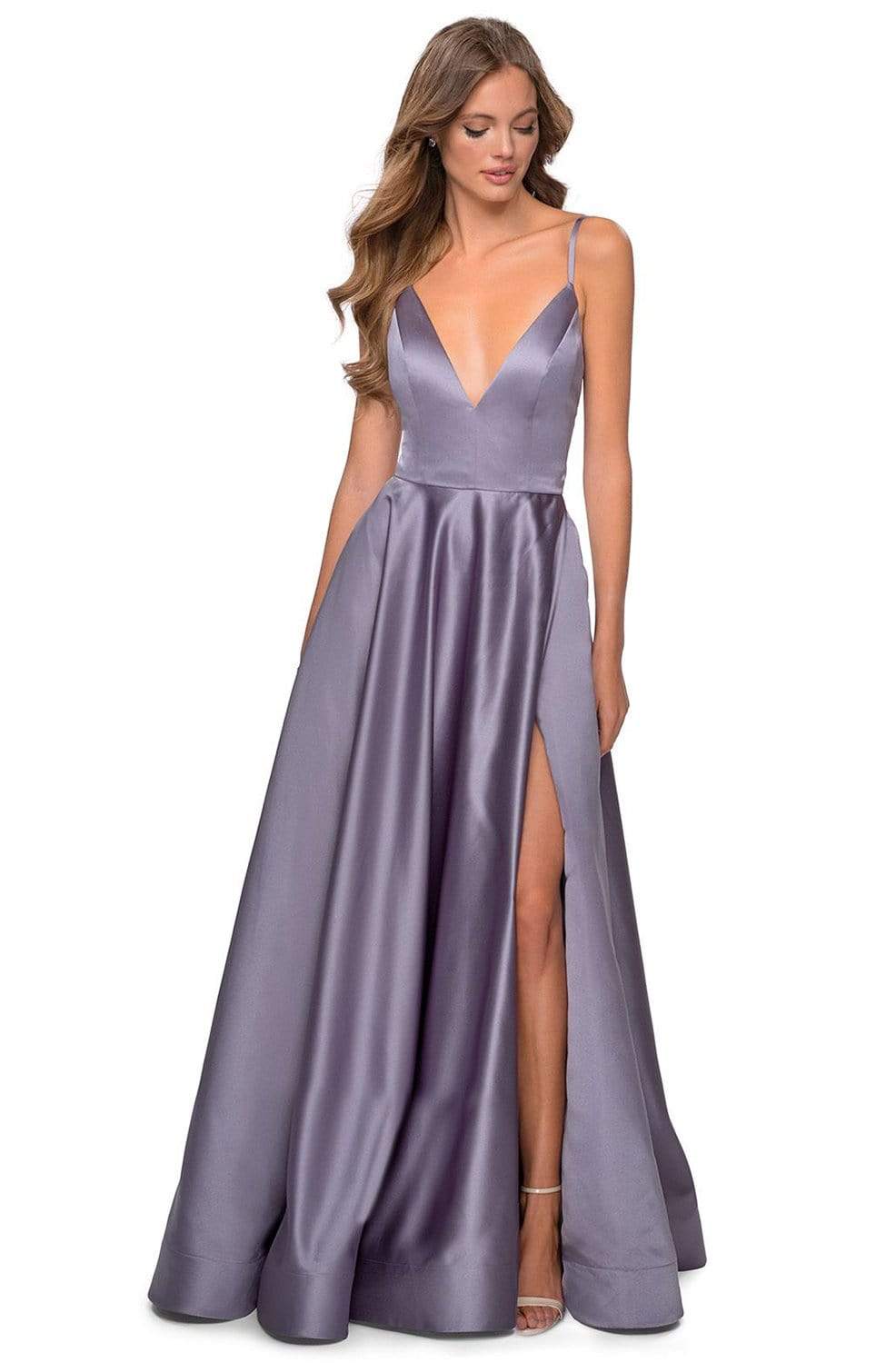 Look timeless in this sleek and chic dress from La Femme 28628. Dazzles in a sleeveless. deep V-neckline with straps connecting to the strappy back. This satin dress flatters with a fitted bodice and from the waist flourishes a full length A-line silhouette with a high leg slit. Be in this gorgeous La Femme creation and leave a lasting impression.