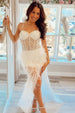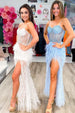 Elevate your prom night aura with Elora. a dress designed for the goddess in you. Its ethereal feather fabric in pure white and soft sky blue hues accentuates the body in a sleek sheath silhouette. perfectly tailored to glide over every curve. Delicate spaghetti straps lead to a flattering sweetheart neckline. highlighting the décolletage with a touch of elegance. The illusion lace appliqued bodice. adorned with shimmering beadings. offers a sultry glimpse of skin. leading the gaze to the bold slit that promises a dramatic entrance.