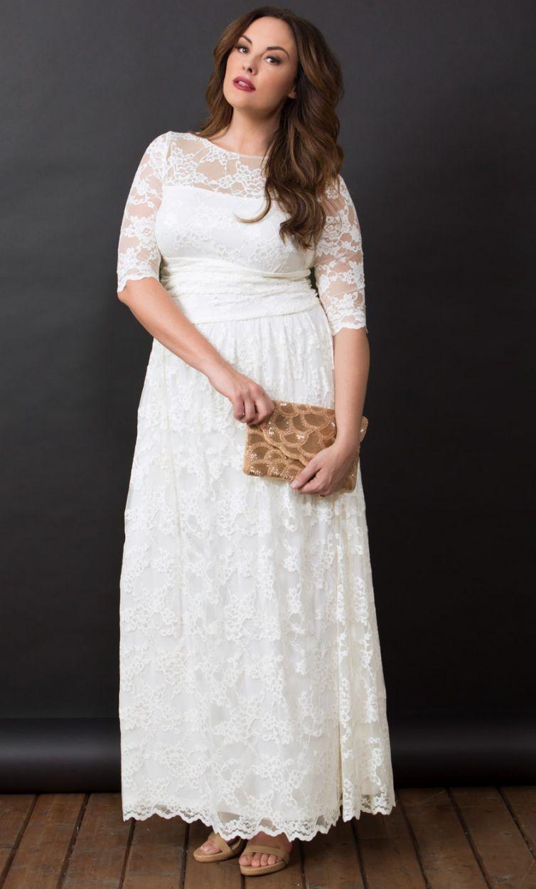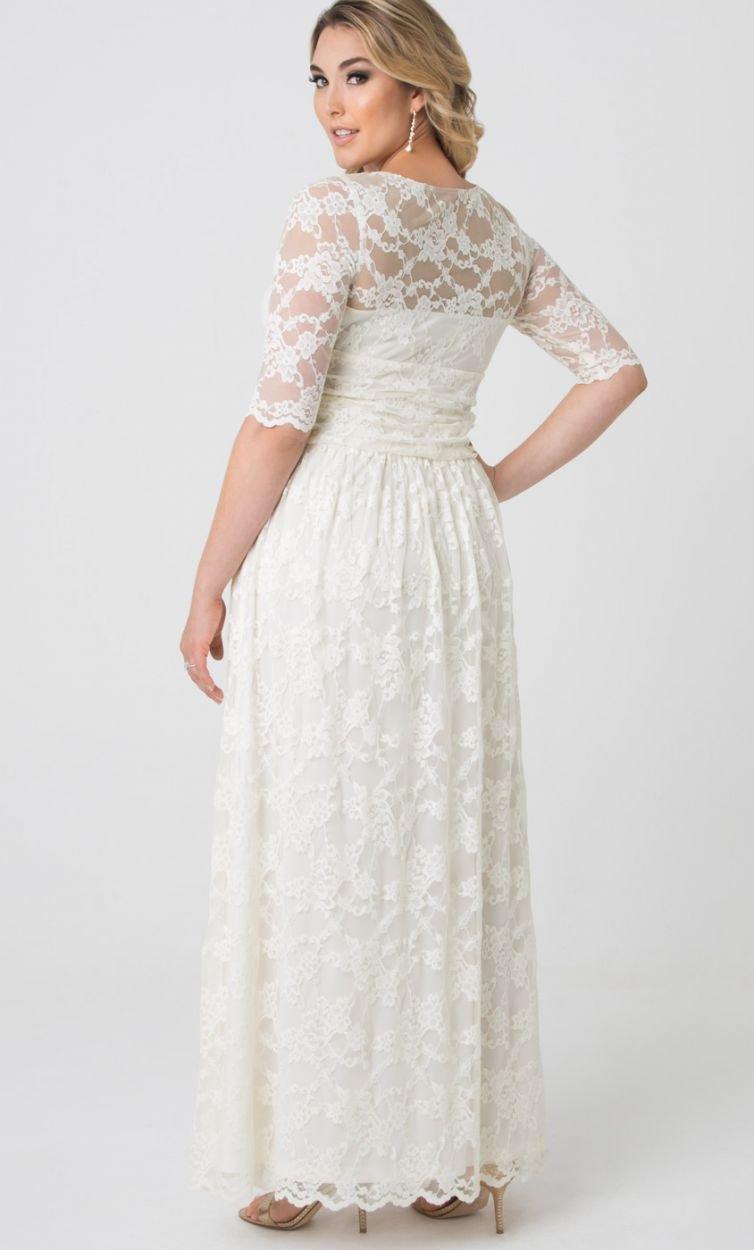 This gown boasts the same flattering ruched waistband and delicate scalloped lace. The illusion neck is designed with a nude mesh lining to hide bra straps and the sheer lace continues to the sleeves for a graceful. yet demure touch.