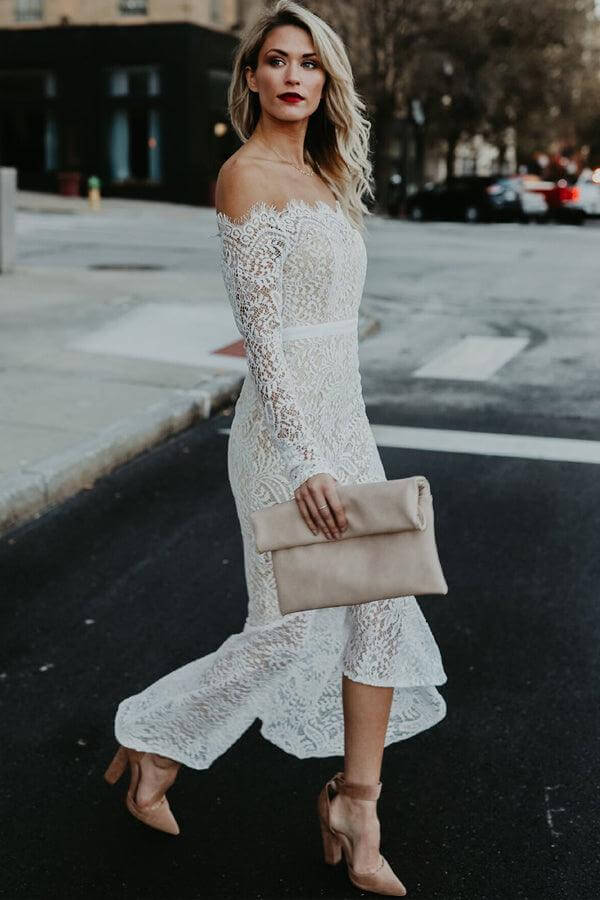 Lace Mermaid Off Shoulder High Low Long Sleeves Wedding Dresses.