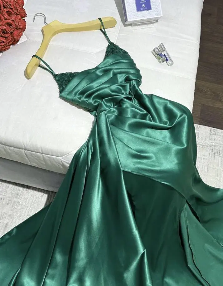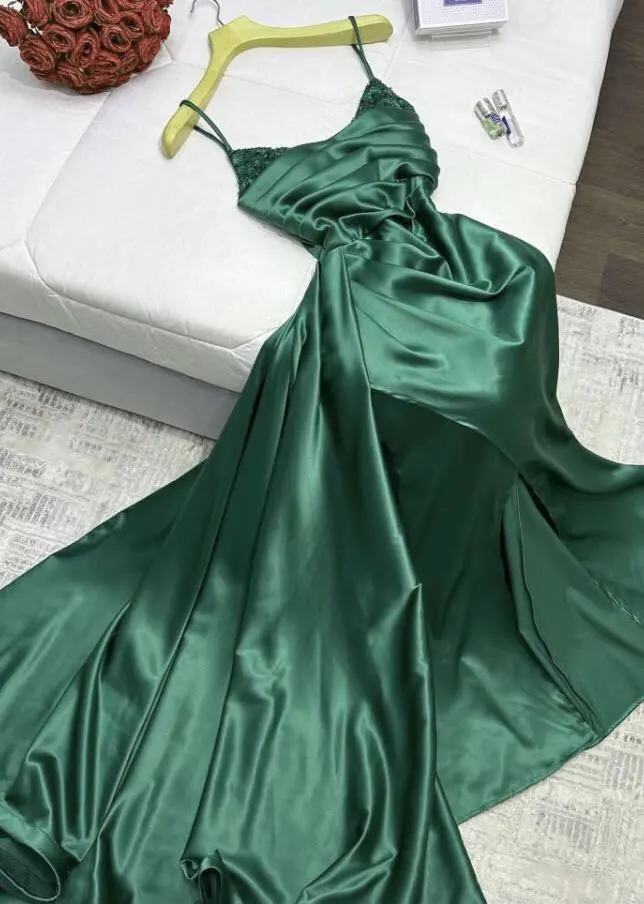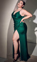 Details: | Sleeveless. Thin Strap. Faux-Wrap Bodice. Ruched. Mid-Open Back. Back Zipper. High Slit. Sweep Train. Plus size |