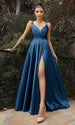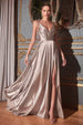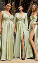 In this Ladivine BD105 creation. you can express your distinct personality and classic sophistication. This show-stopper has spaghetti straps and a plunging V-neckline. and it ripples with lovely draping. This outfit has tie straps and a V-shaped back. The front slit of the skirt allows it to flow into a long train at the back. Capture the sparkle and glamour as you walk on this magnificent Ladivine BD105 masterpiece. Models are pictured wearing colors Dusty Blue. Burgundy. Desert Rose. Emerald. French Navy. Mahogany. Mauve. Sage. and Sienna.