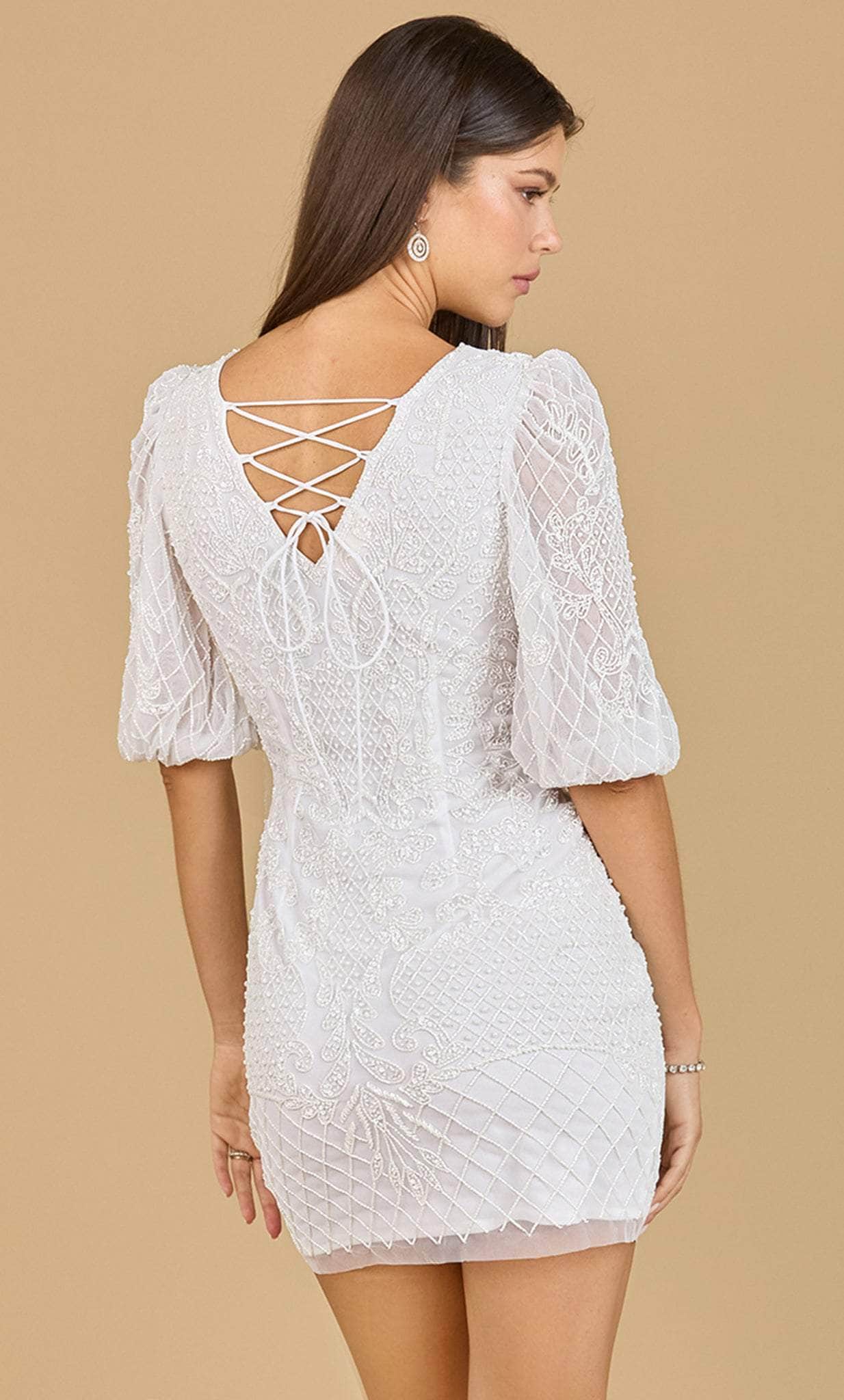 Claim that look of sophistication wearing this classy Lara Dresses 51118 bridal creation on your special day. Embellished with a spectacle of intricate beadwork allover its length. this bridal beauty charms with a deep v-neckline and a sheer tonal inset. Flanked with elbow length puff sleeves. the back is accentuated with a deep v-open style and a lace up detail. The sheath skirt sculpts along the curves as it ends with a mini hemline. Create a distinction with a regal flair in this exquisite on your wedding day in this Lara Dresses bridal masterpiece. Model is wearing the Ivory color.