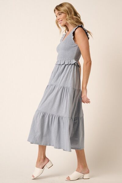 The Smocked Ruffled Tiered Midi Dress is a feminine and romantic option for any event. Its smocked bodice provides a comfortable and flattering fit. The ruffled tiered skirt adds movement and a touch of whimsy to the dress. Perfect for summer outings or special occasions. this midi dress is sure to turn heads wherever you go.