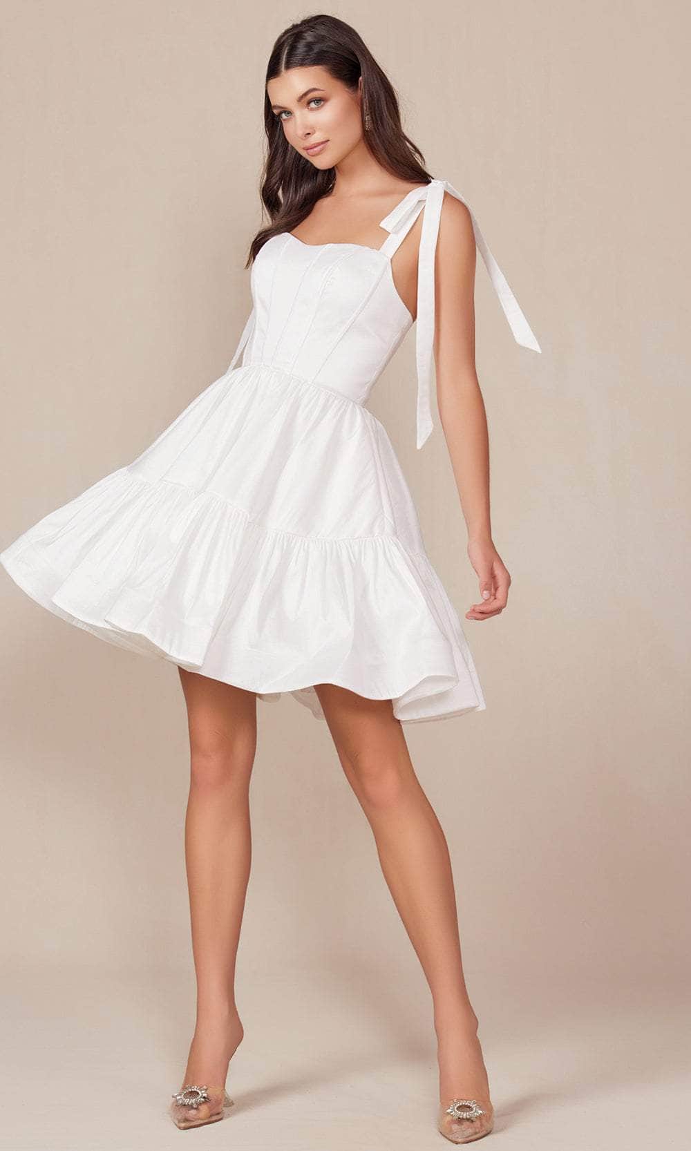 Mesmerize everyone in this Nox Anabel is a fabulous short-length dress featuring a sleeveless bodice detailed with boning and a semi-sweetheart neckline. It includes tie straps and a lace-up tie for adjustable fit and style. A center back zipper ensures a perfect fit. while the A-line skirt adds a touch of charm and elegance. Ideal for various special occasions. this Nox Anabel T869W effortlessly combines sophistication and modern style. ensuring you make a memorable statement wherever you go. Model is wearing White color.