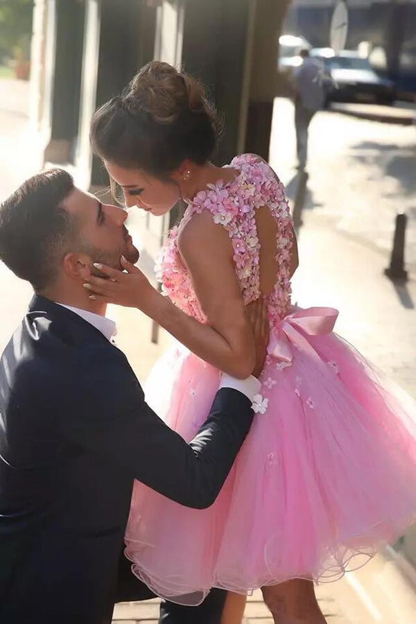Pink Tulle Hand-Made Flowers Short Prom Dresses. Homecoming Dress.