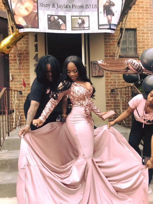 Popular Rose Pink Sequins Mermaid V-Neck Long Sleeves Prom Dresses with Court Train.