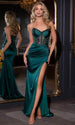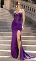 Indulge in timeless glamour with the Portia and Scarlett PS25188 prom dress. This enchanting gown showcases a strapless silhouette and a deep V-neckline that enhances confidence and elegance. Sparkling hot stone crystals adorn the corseted bodice. creating a sculpted. glamorous look. Draped elements and a midrise back contribute to its sophistication. while the high-slit sheath skirt and flowing train add a dramatic flair. The Portia and Scarlett PS25188 design is perfect for making a memorable impression on prom night. Models are wearing the Purple. Emerald. Red. and Hot Pink. colors.