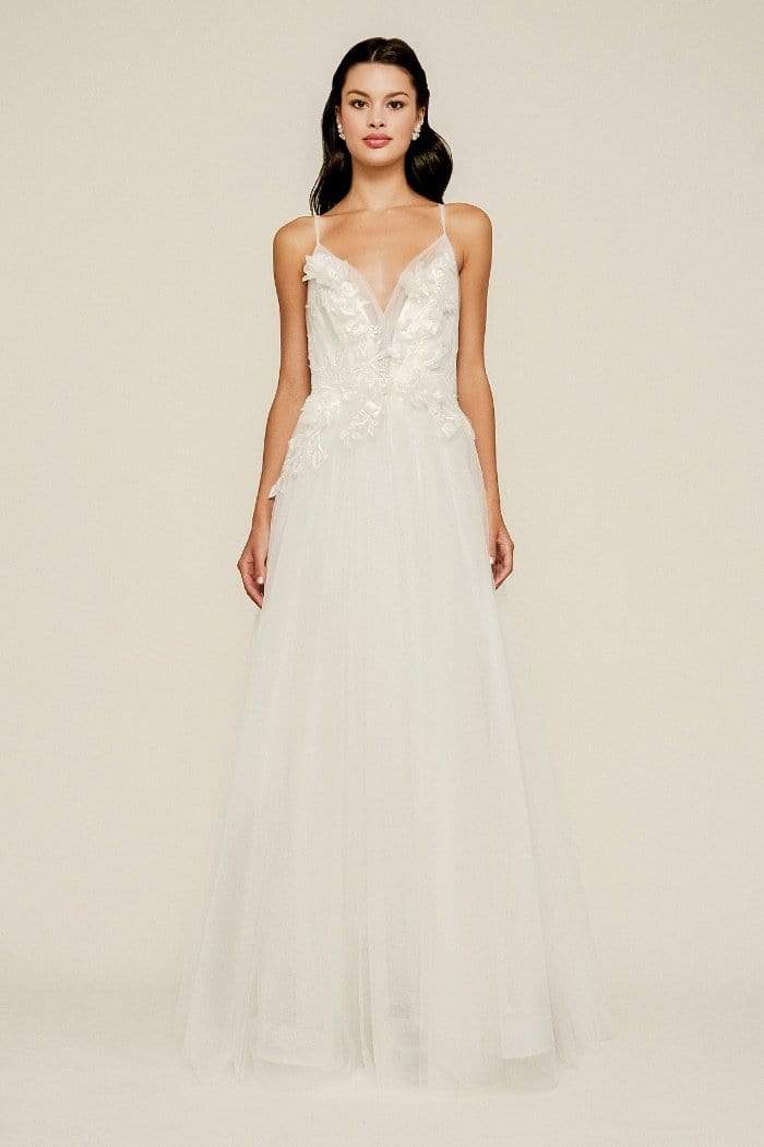 Tadashi Shoji YS19219LBR wedding dress perfect for the bride who wants a romantic. ethereal look for her wedding day. Applique flowers artfully spill down a draped bodice while airy tulle creates a weightless silhouette that will surely have you daydreaming of your walk down the aisle in a romantic gown rich with enchantment and stylish details. A day worth remembering deserves a dress worth wearing. This Tadashi Shoji design is ideal for the bride who wants to exude classic sophistication while living out her modern-day fairytale.