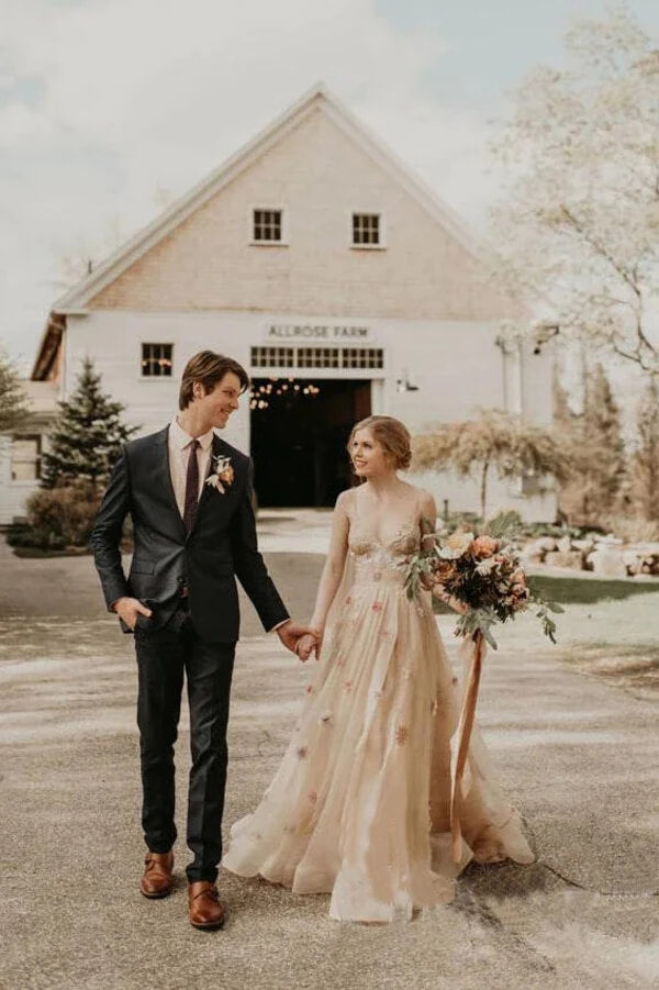 Tulle V-neck 3D Flowers Spaghetti Straps Wedding Dresses. Bridal Gown.