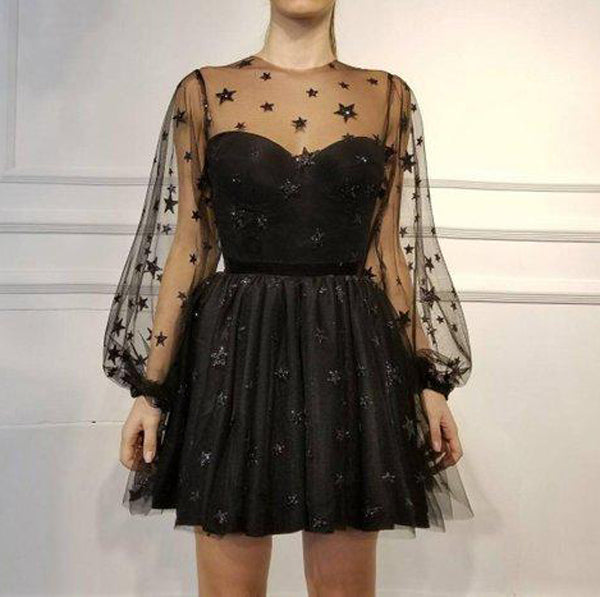 Unique Long Sleeve Short Sheer Neck Stars Mini Homecoming Dress.