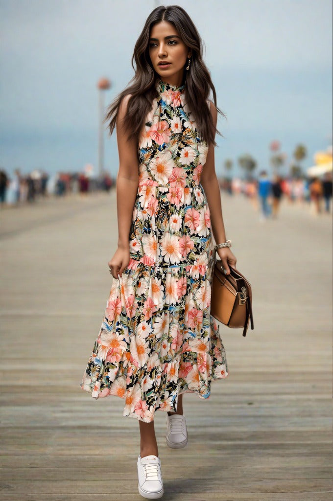 Introducing our Floral Tiered Pocketed Mock Neck Midi Dress – the epitome of chic comfort for your sunny escapades! Embrace effortless elegance with its charming floral print and sophisticated mock neck design. perfectly complemented by practical pockets.